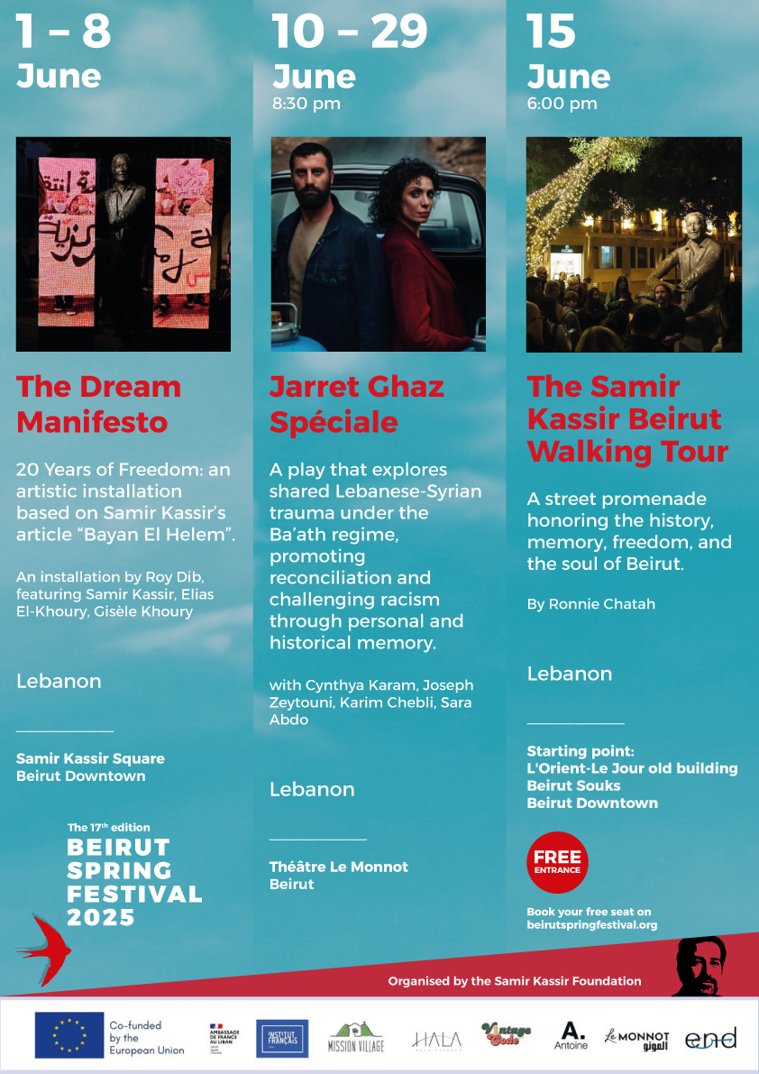 A series of eighteen panel discussions on key challenges facing freedom of expression and democratic change in the region, hosted by the Beirut Spring Festival 2015, the SKeyes Center for Media and Cultural Freedom, and other international partners, from Sunday 3 to Saturday 30 May 2015 in multiple locations in Beirut.