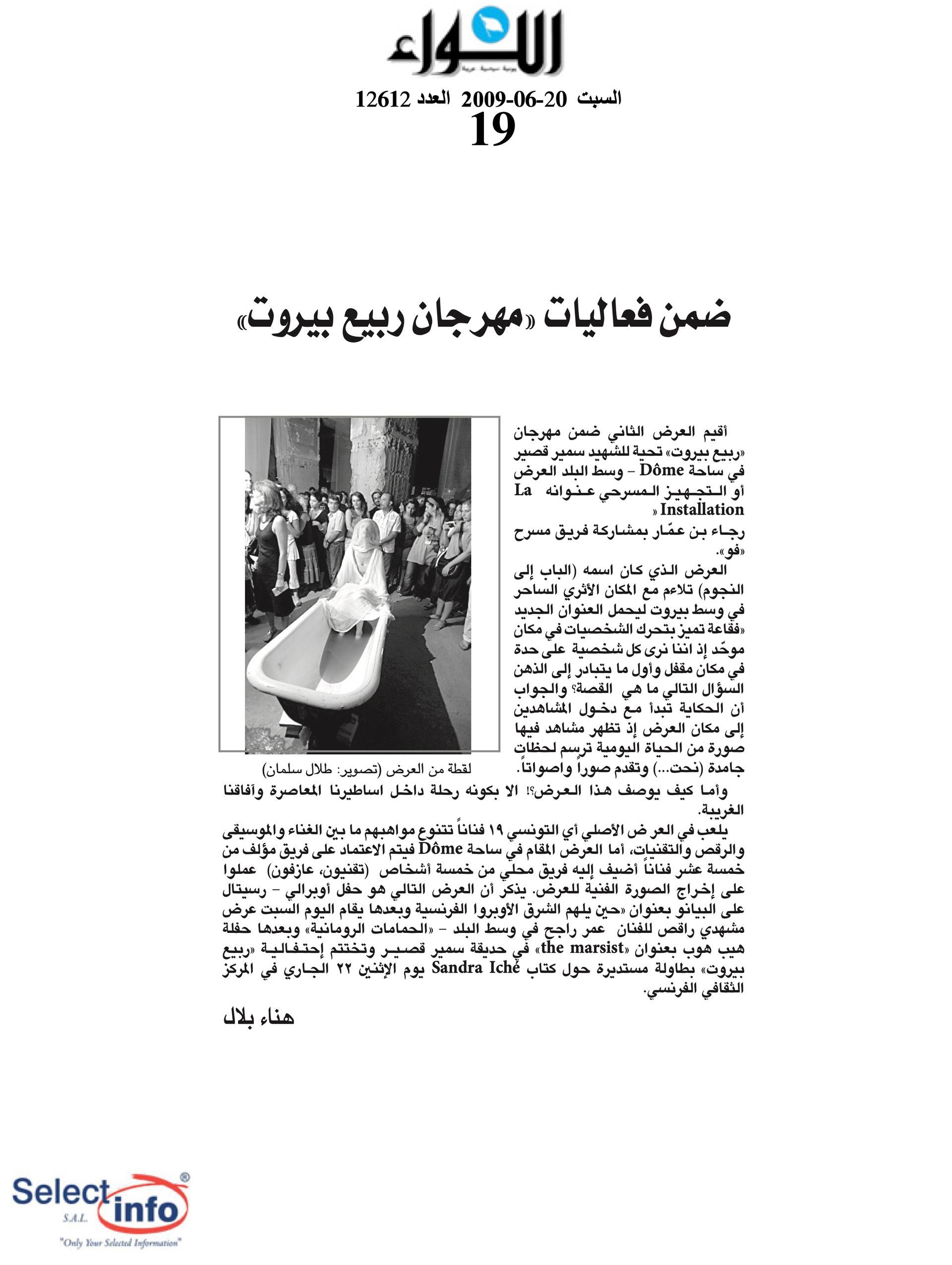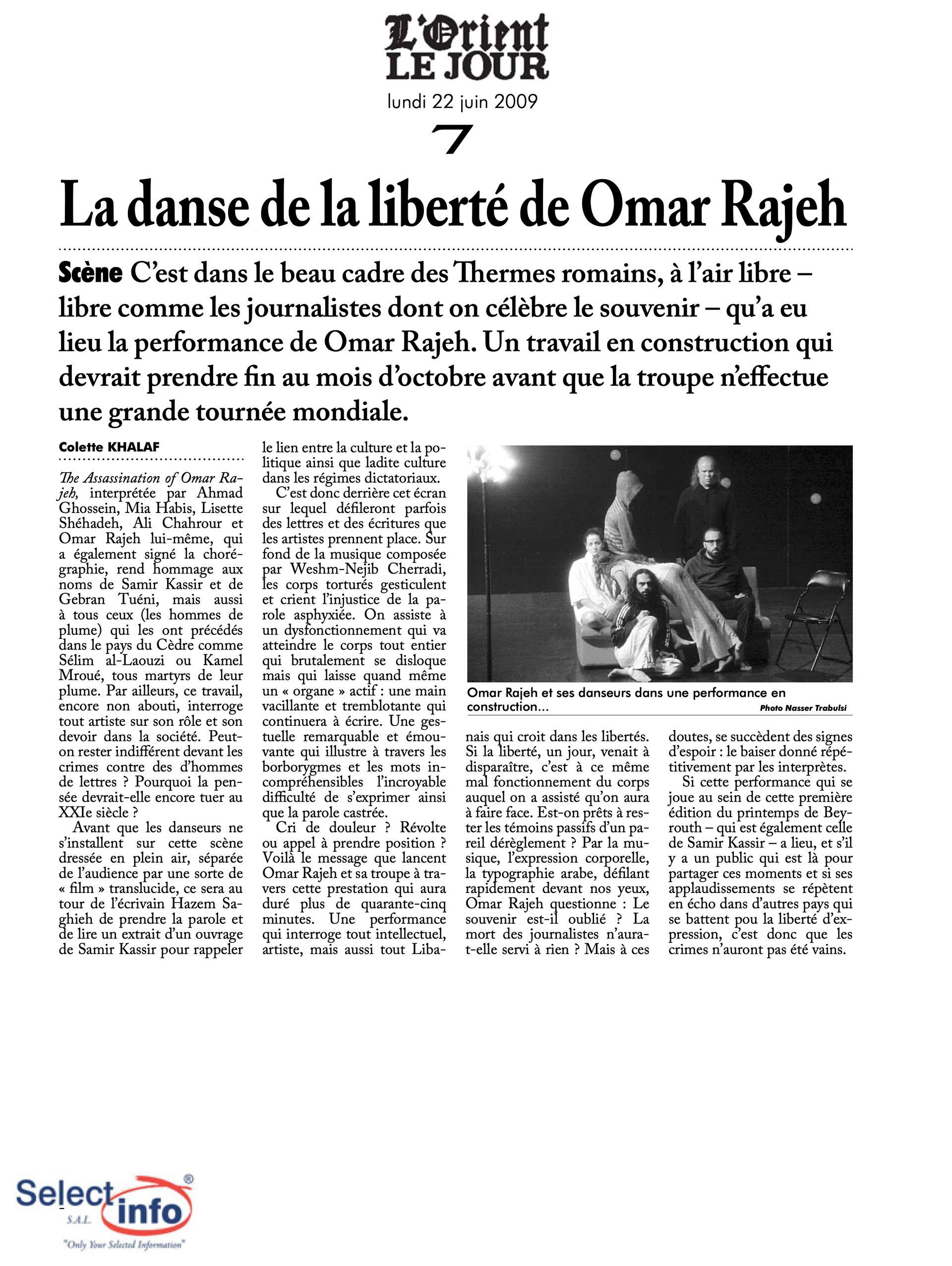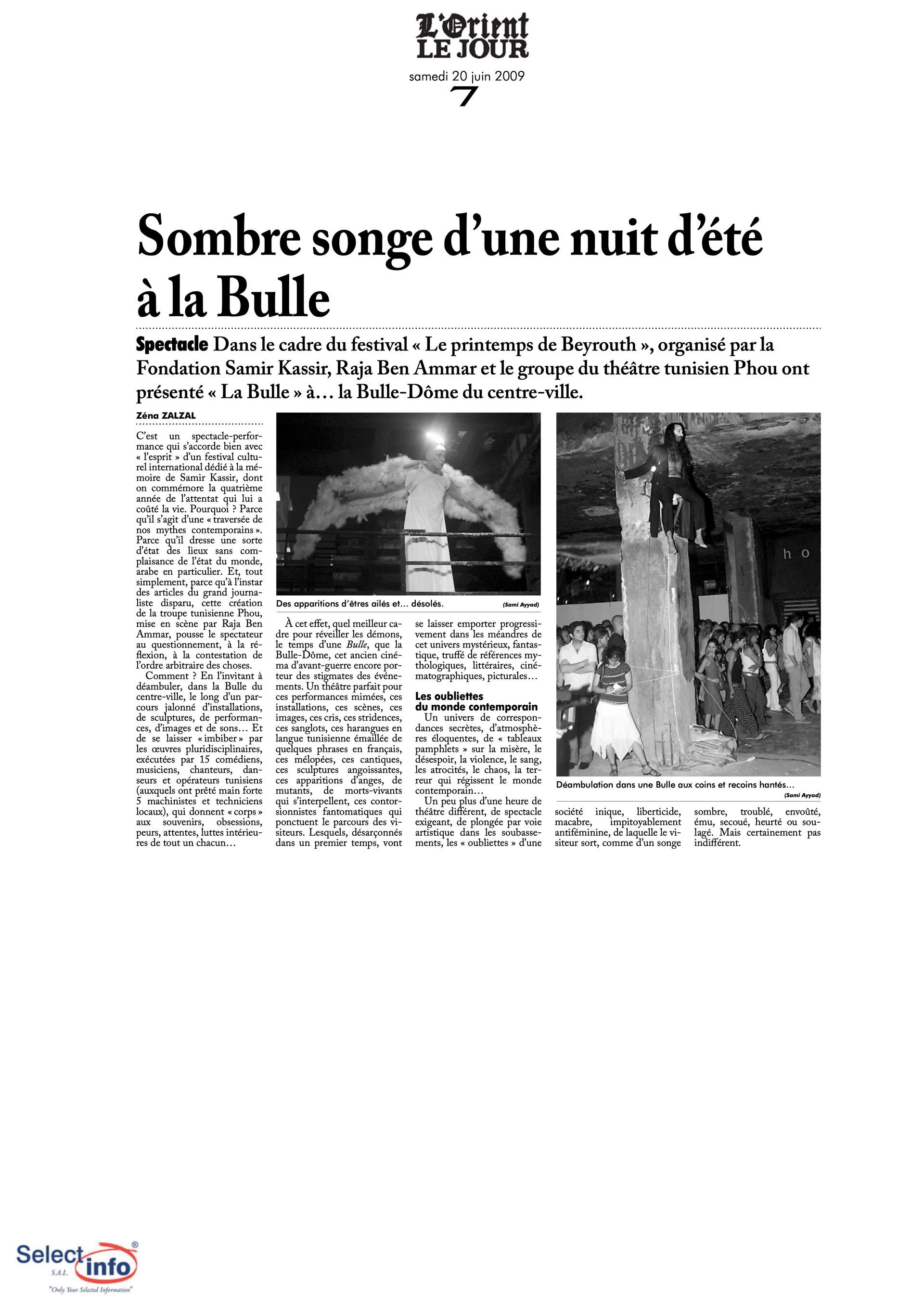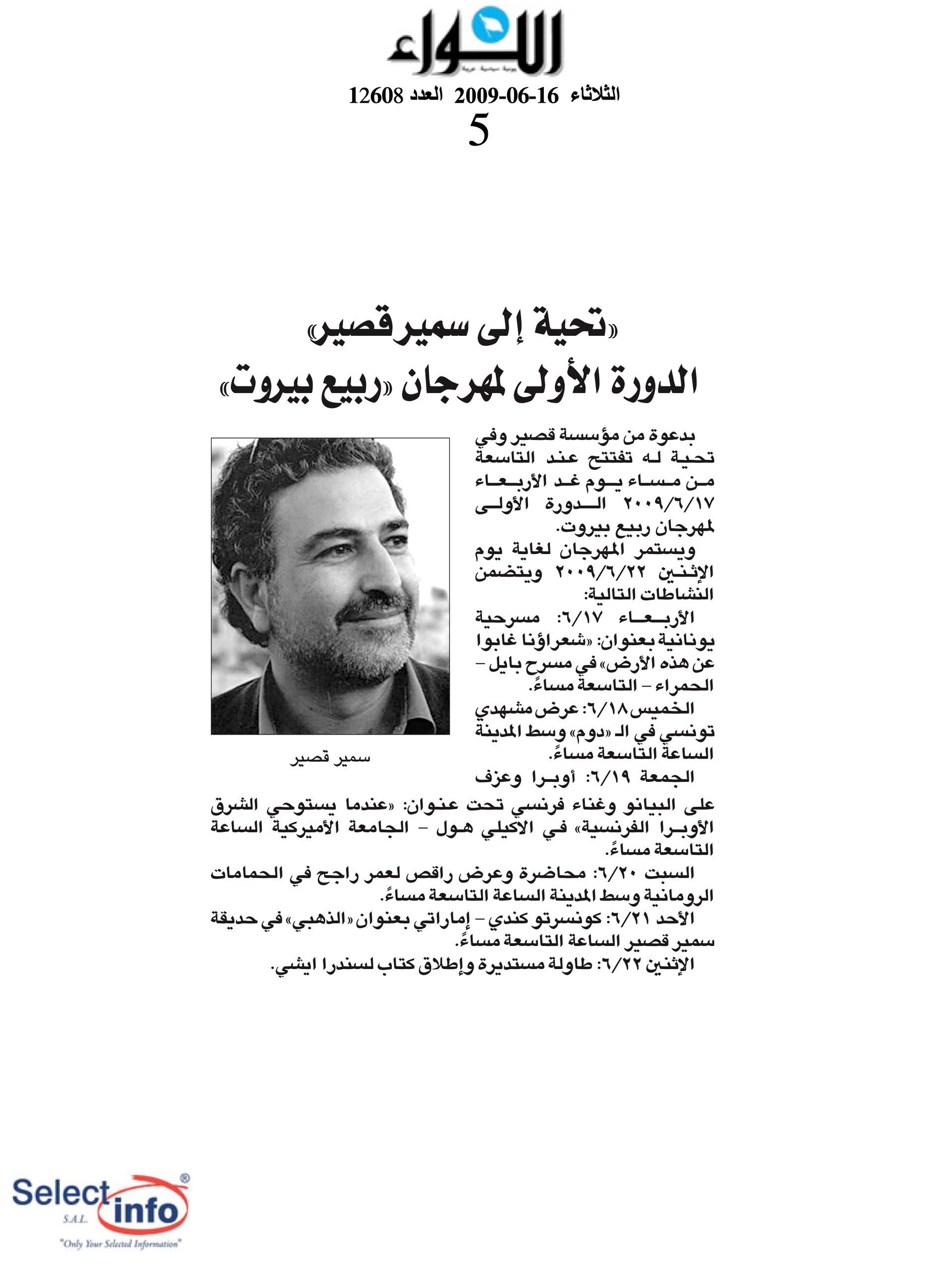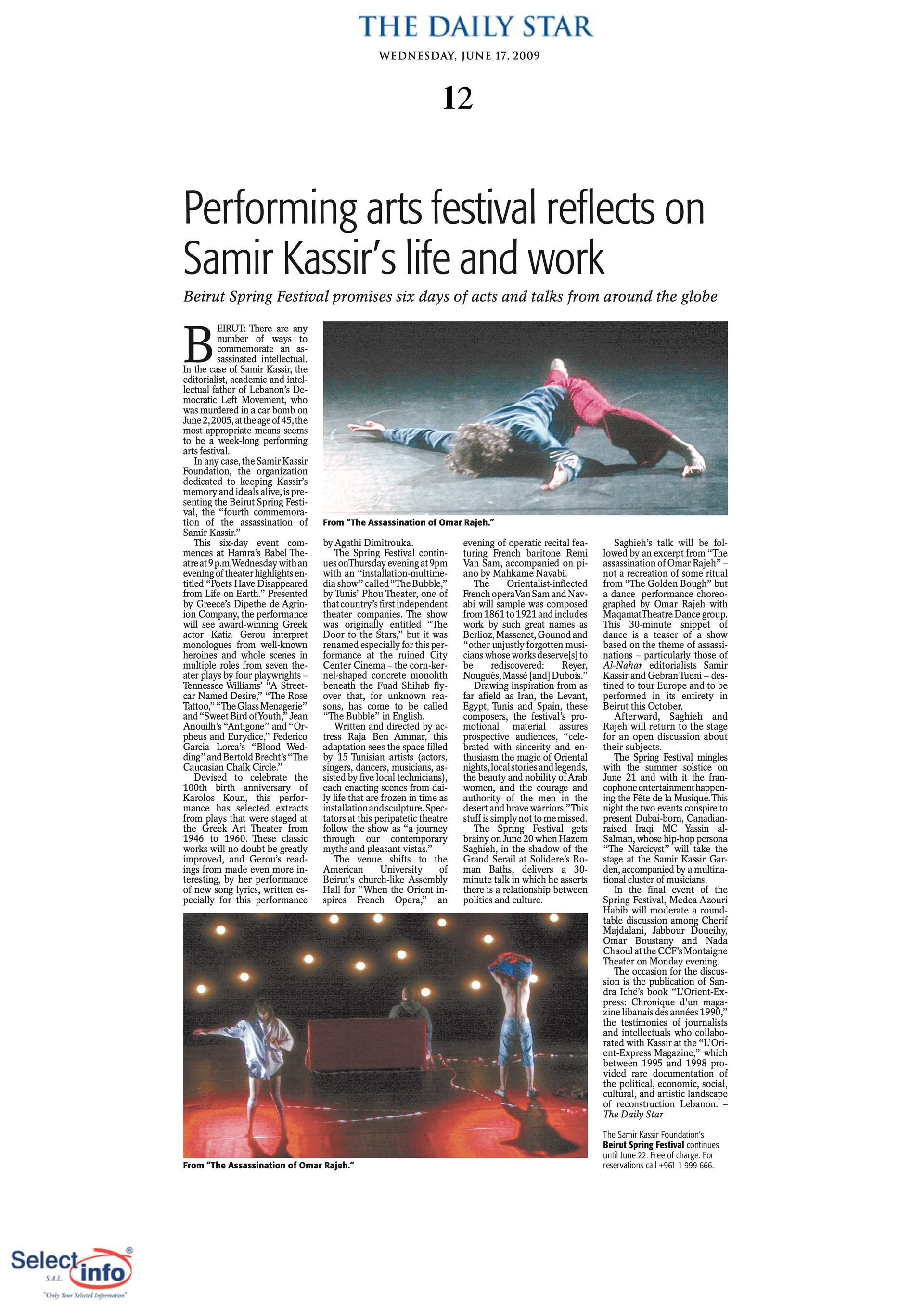 The first edition of the Beirut Spring Festival took place on the 4th anniversary of the assassination of journalist Samir Kassir. Produced by the Samir Kassir Foundation, the Festival presented a 6-day program featuring theatre, multimedia installation, performance, opera concert, a dance performance conference, a hip hop concert, and a roundtable about the Orient Express book. This first edition gathered talent from Lebanon, Greece, Tunisia, France, Iran, Canada and the UAE in a variety of indoor and outdoor locations (theatre halls, architecture of decay, public garden and a Roman historic site) thanks to the support of 11 partners and the coverage of the press for the pleasure of the participants.