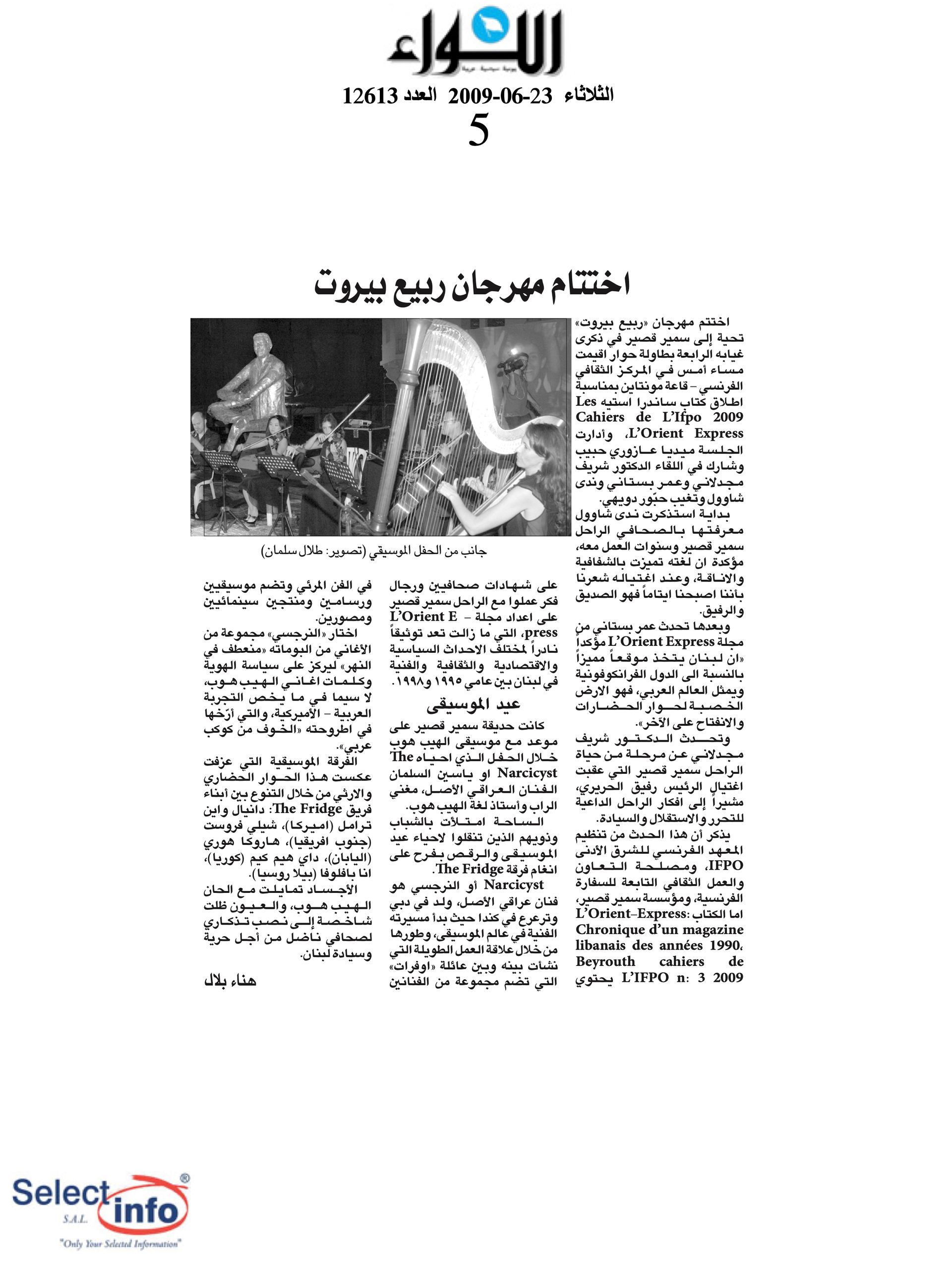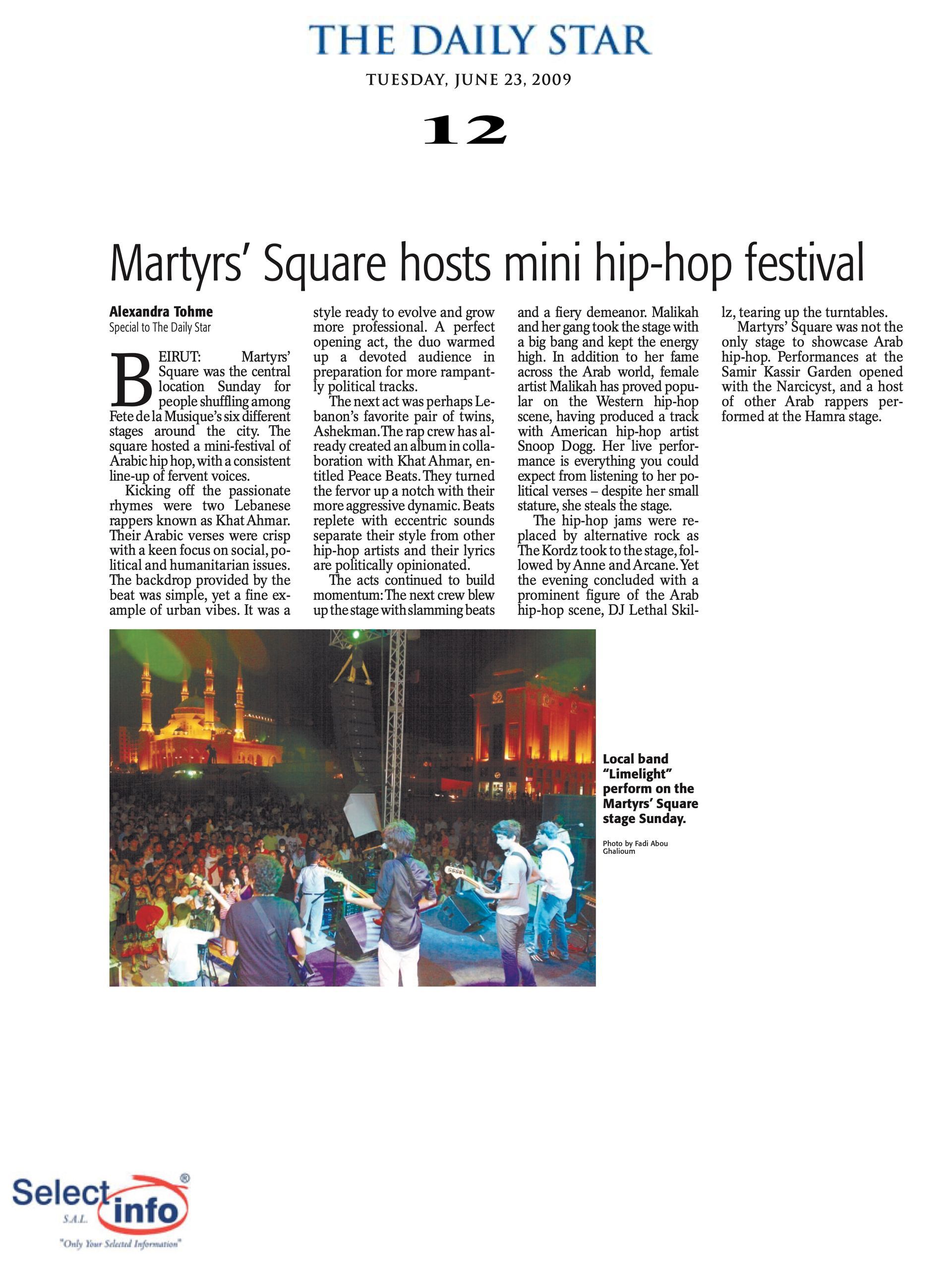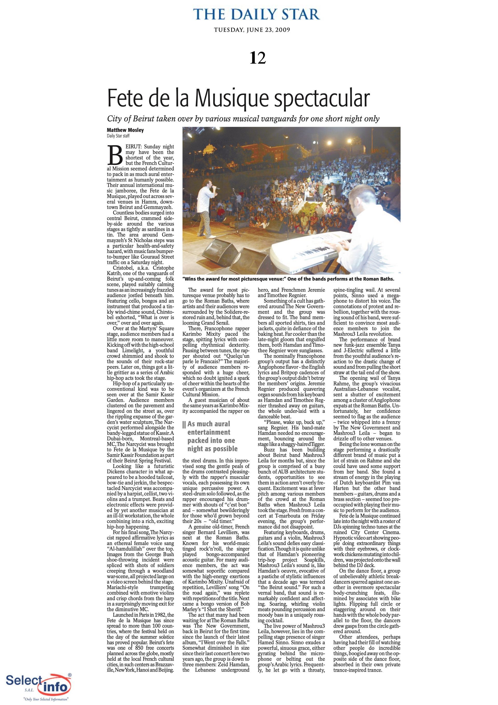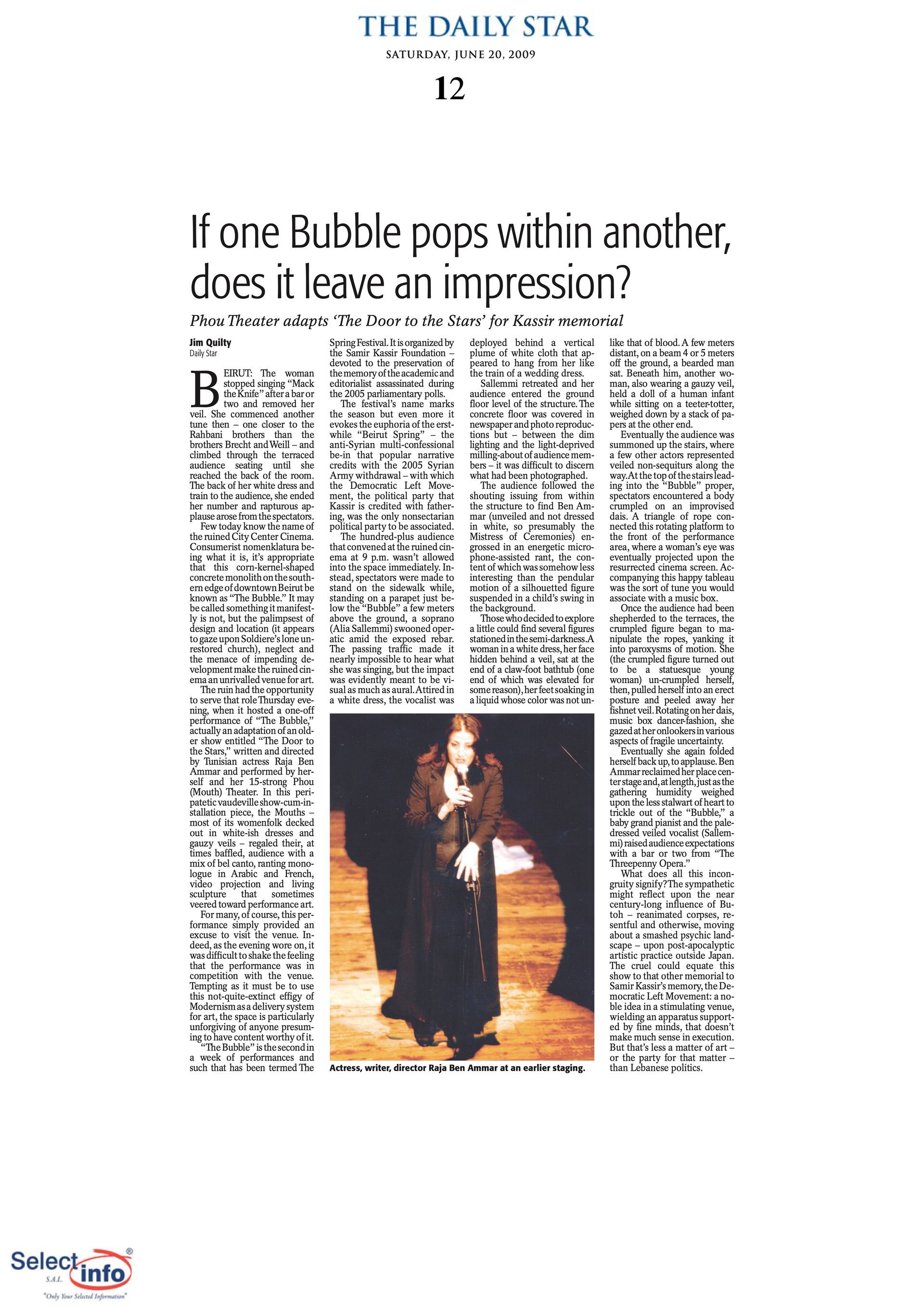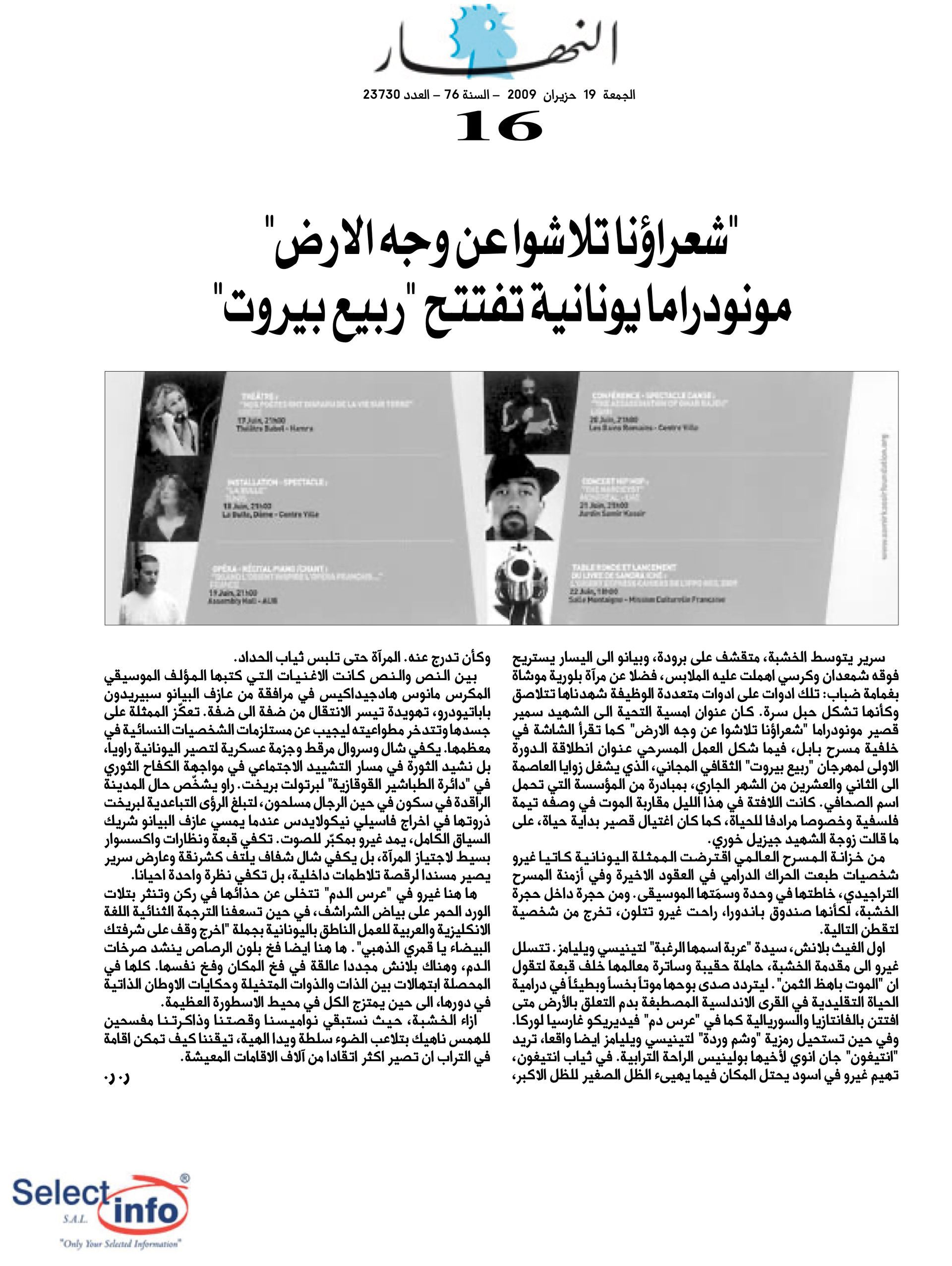 The first edition of the Beirut Spring Festival took place on the 4th anniversary of the assassination of journalist Samir Kassir. Produced by the Samir Kassir Foundation, the Festival presented a 6-day program featuring theatre, multimedia installation, performance, opera concert, a dance performance conference, a hip hop concert, and a roundtable about the Orient Express book. This first edition gathered talent from Lebanon, Greece, Tunisia, France, Iran, Canada and the UAE in a variety of indoor and outdoor locations (theatre halls, architecture of decay, public garden and a Roman historic site) thanks to the support of 11 partners and the coverage of the press for the pleasure of the participants.