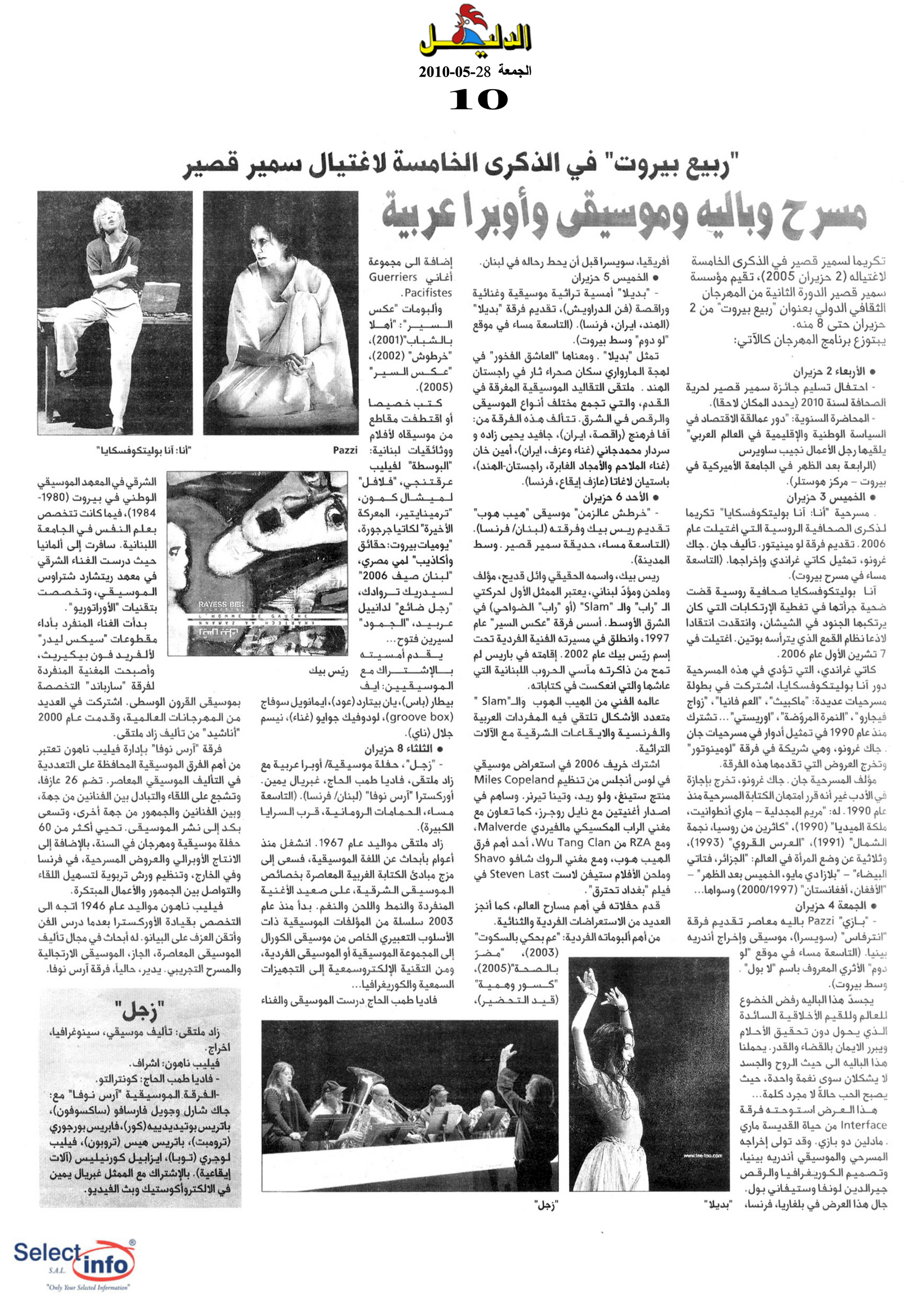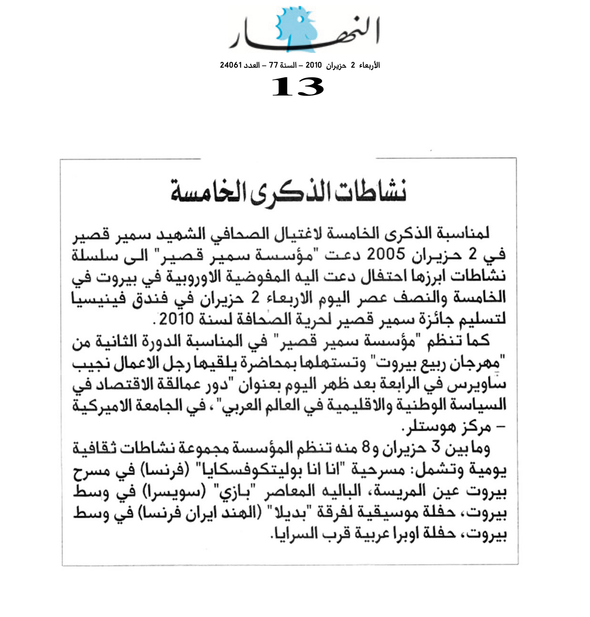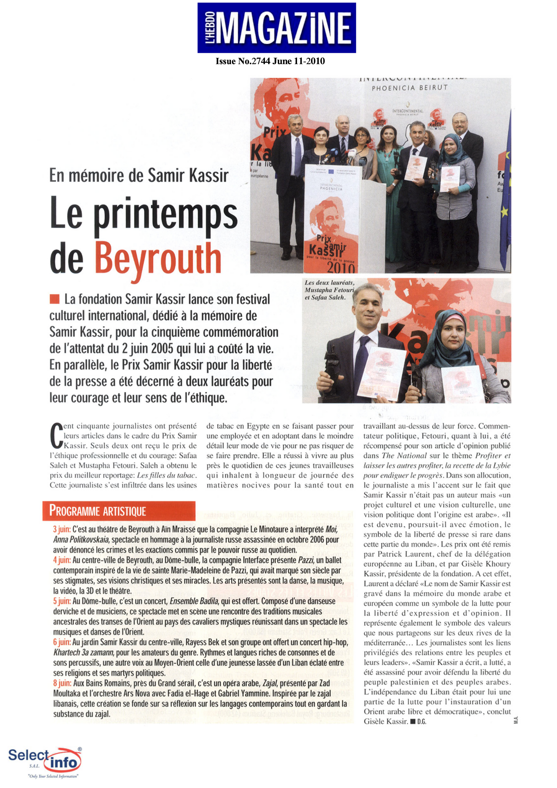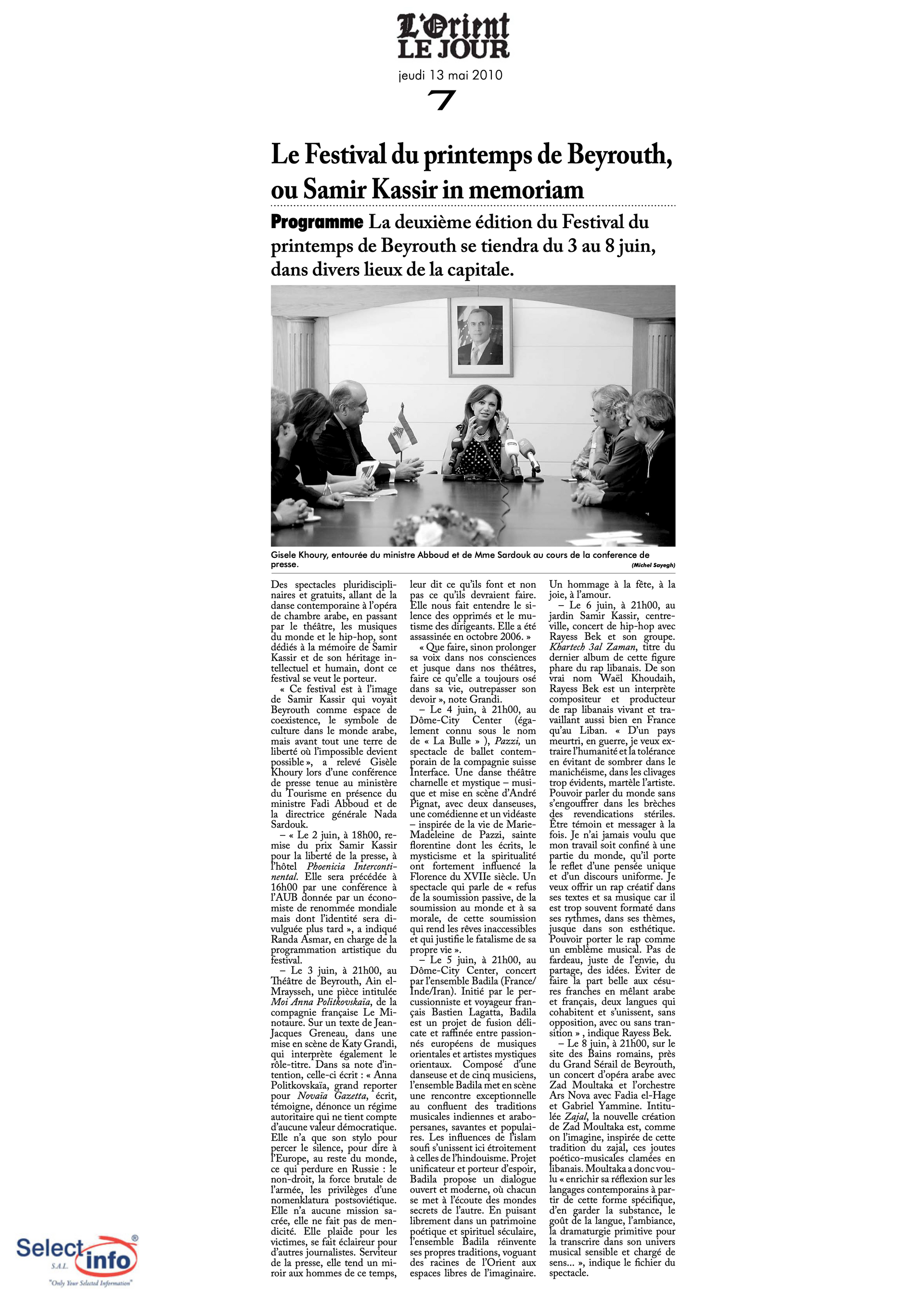 The second edition of the Beirut Spring Festival took place from 3 to 8 June 2010. Produced by the Samir Kassir Foundation, the Festival presented a five-day program featuring theatre, contemporary ballet, concert, zajal, opera, hip-hop, and dance. This second edition gathered talent from Lebanon, France, Switzerland, India and Iran in a variety of indoor and outdoor locations (theatre halls, architecture of decay, public garden and a Roman historic site) thanks to the support of 17 partners and the coverage of the press for the pleasure of the participants.