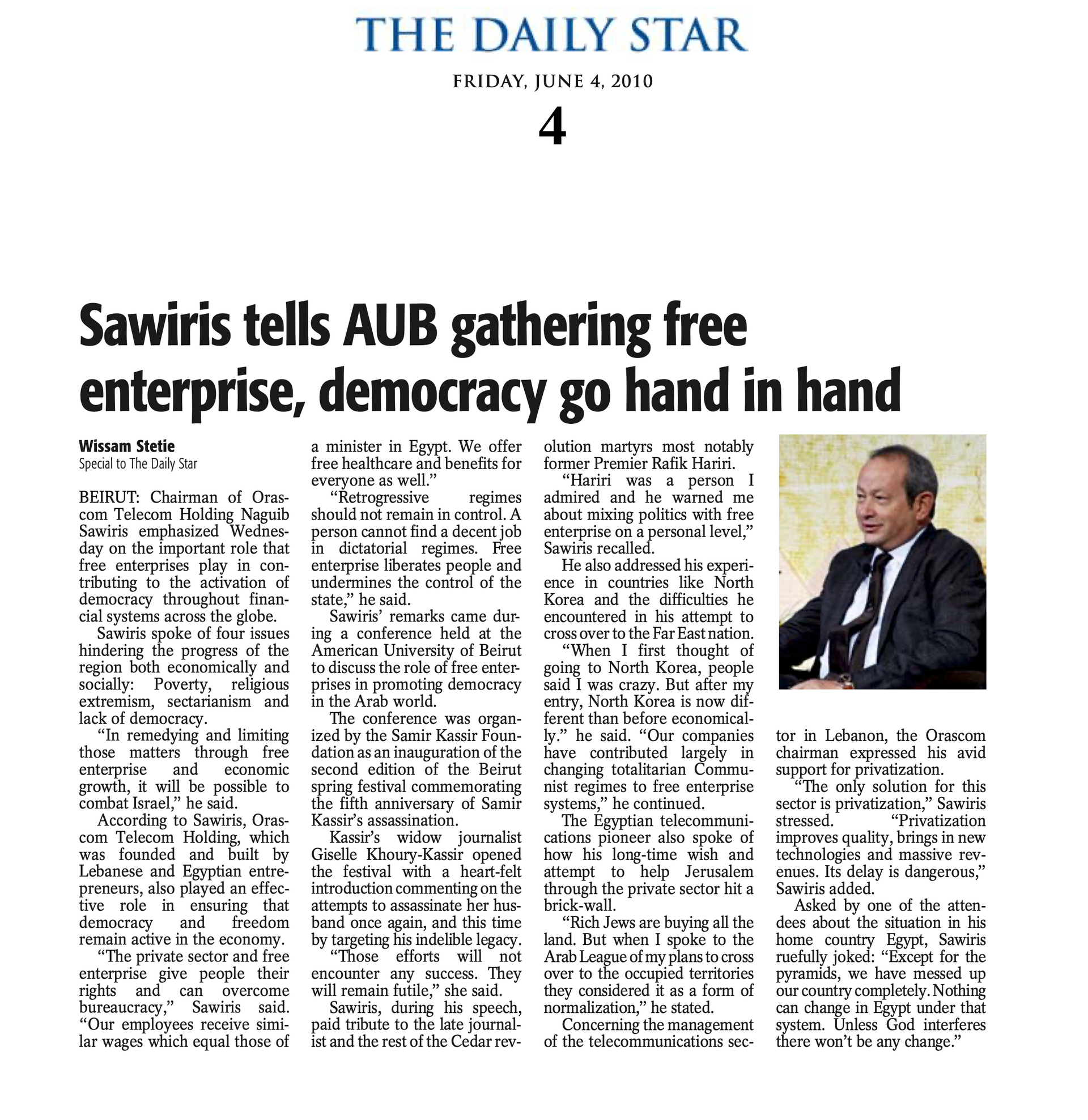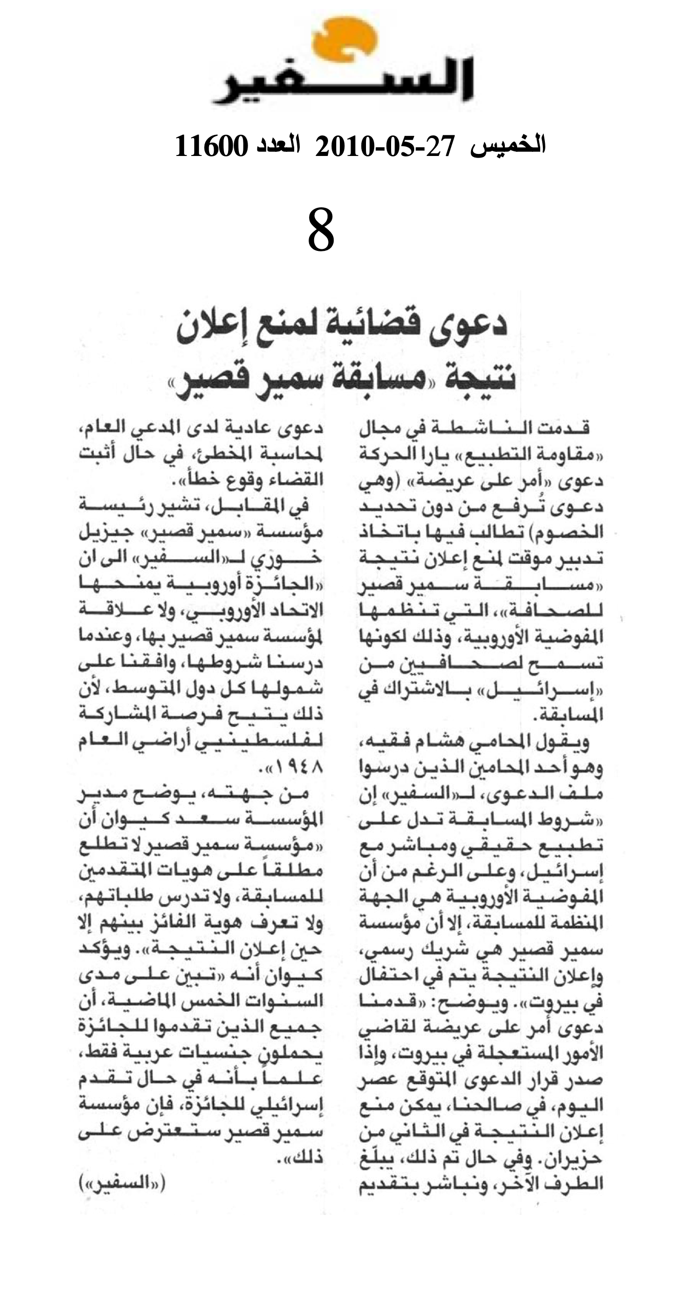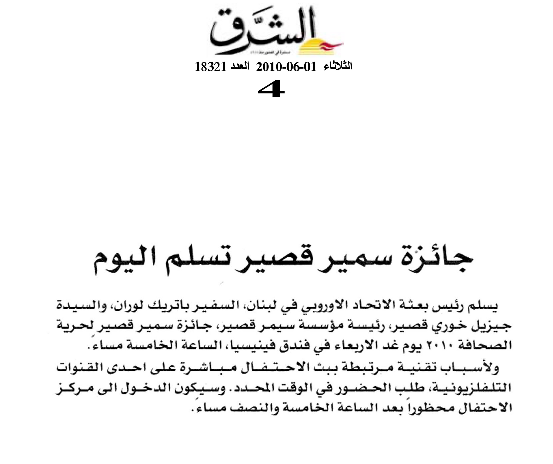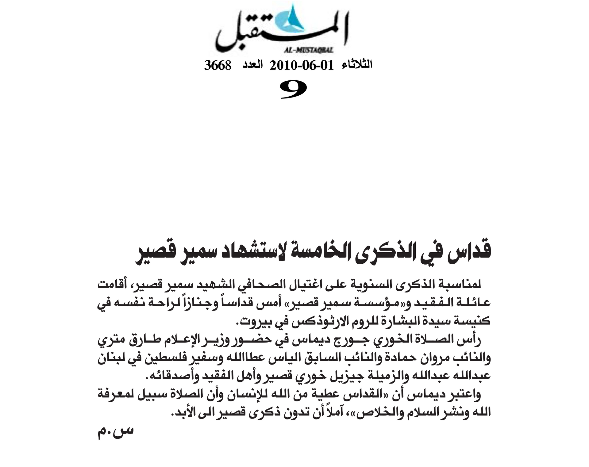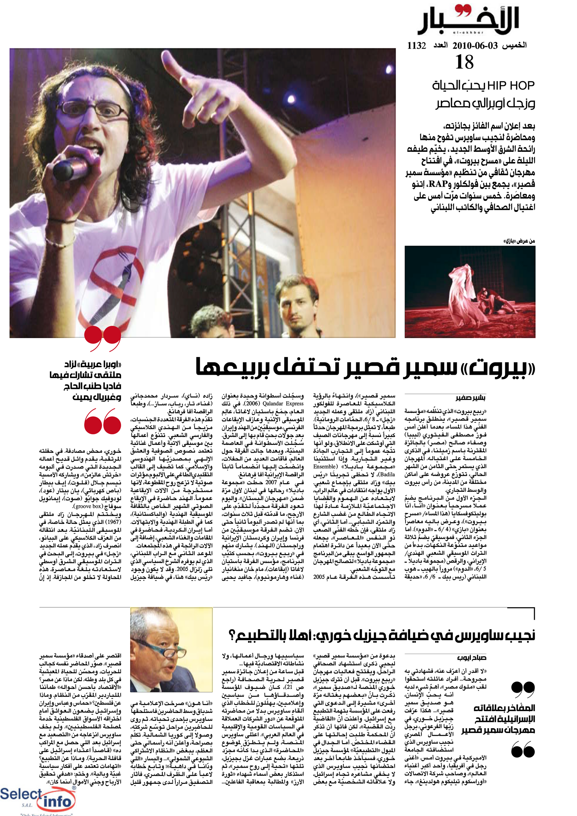 The second edition of the Beirut Spring Festival took place from 3 to 8 June 2010. Produced by the Samir Kassir Foundation, the Festival presented a five-day program featuring theatre, contemporary ballet, concert, zajal, opera, hip-hop, and dance. This second edition gathered talent from Lebanon, France, Switzerland, India and Iran in a variety of indoor and outdoor locations (theatre halls, architecture of decay, public garden and a Roman historic site) thanks to the support of 17 partners and the coverage of the press for the pleasure of the participants.