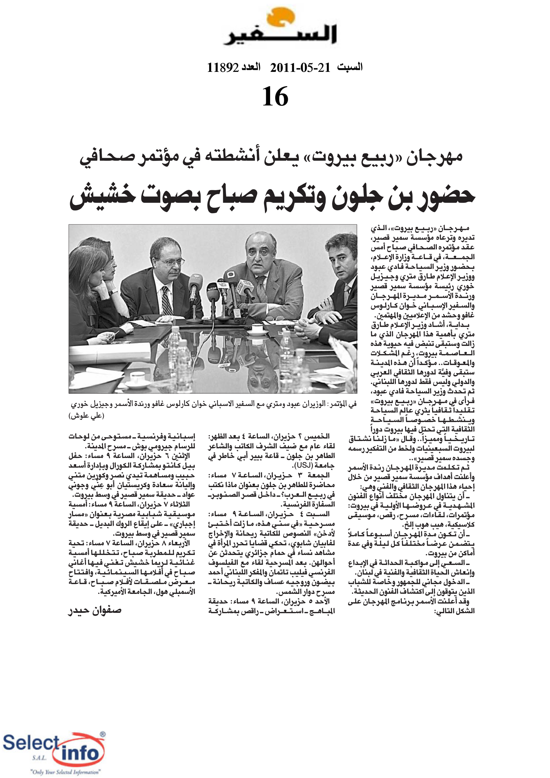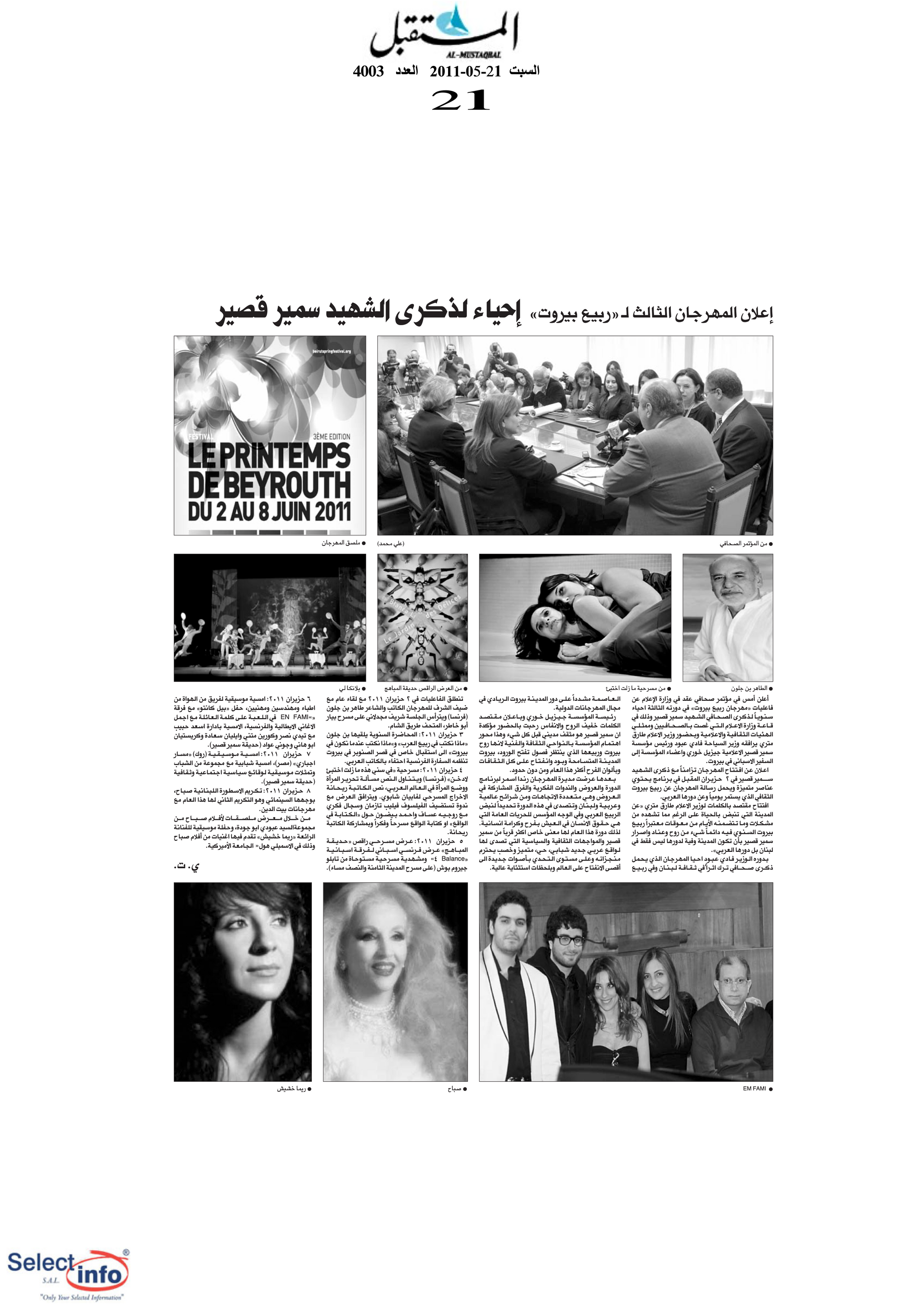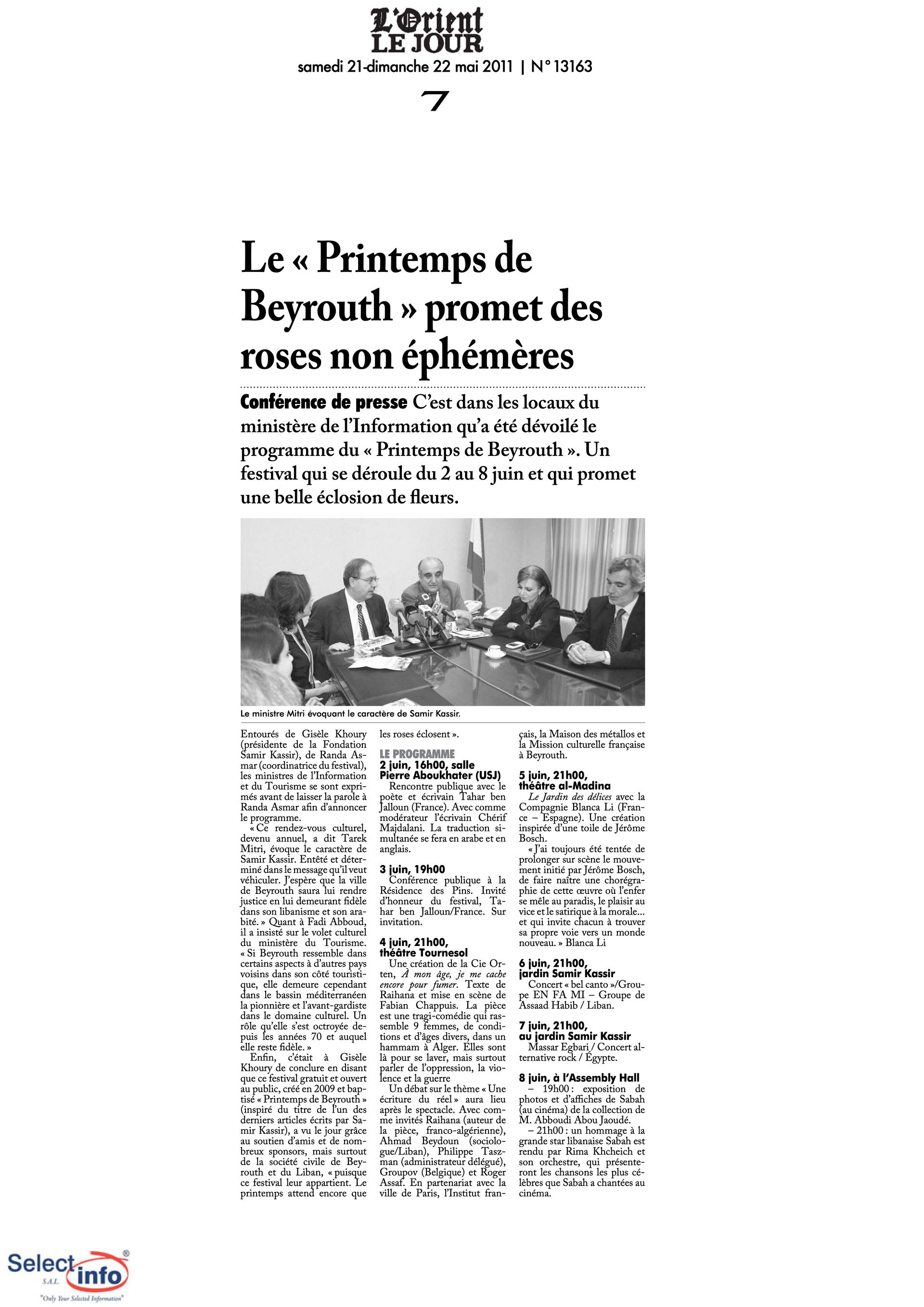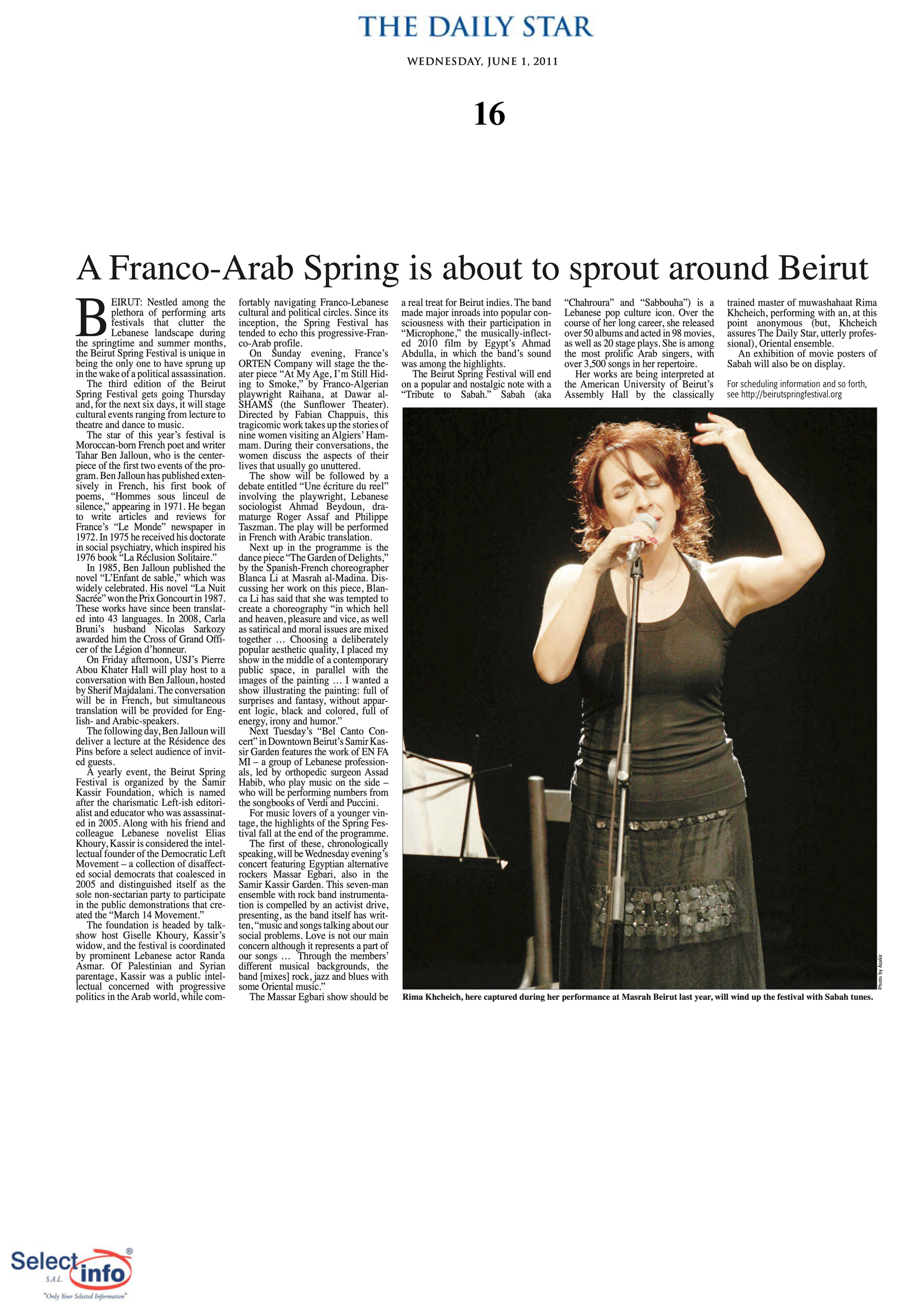 The third edition of the Beirut Spring Festival took place from 2 to 8 June 2011. Produced by the Samir Kassir Foundation, the Festival presented a seven-day program featuring discussions, theatre, dance, concerts, and a tribute to Lebanese singer Sabah. This third edition remained free of charge, and gathered talent from Lebanon, France, Algeria, Spain, Morocco, and Egypt. It took place in a variety of indoor and outdoor locations (theatre halls, university halls and public spaces) thanks to the support of 22 partners and the extensive coverage of the press.