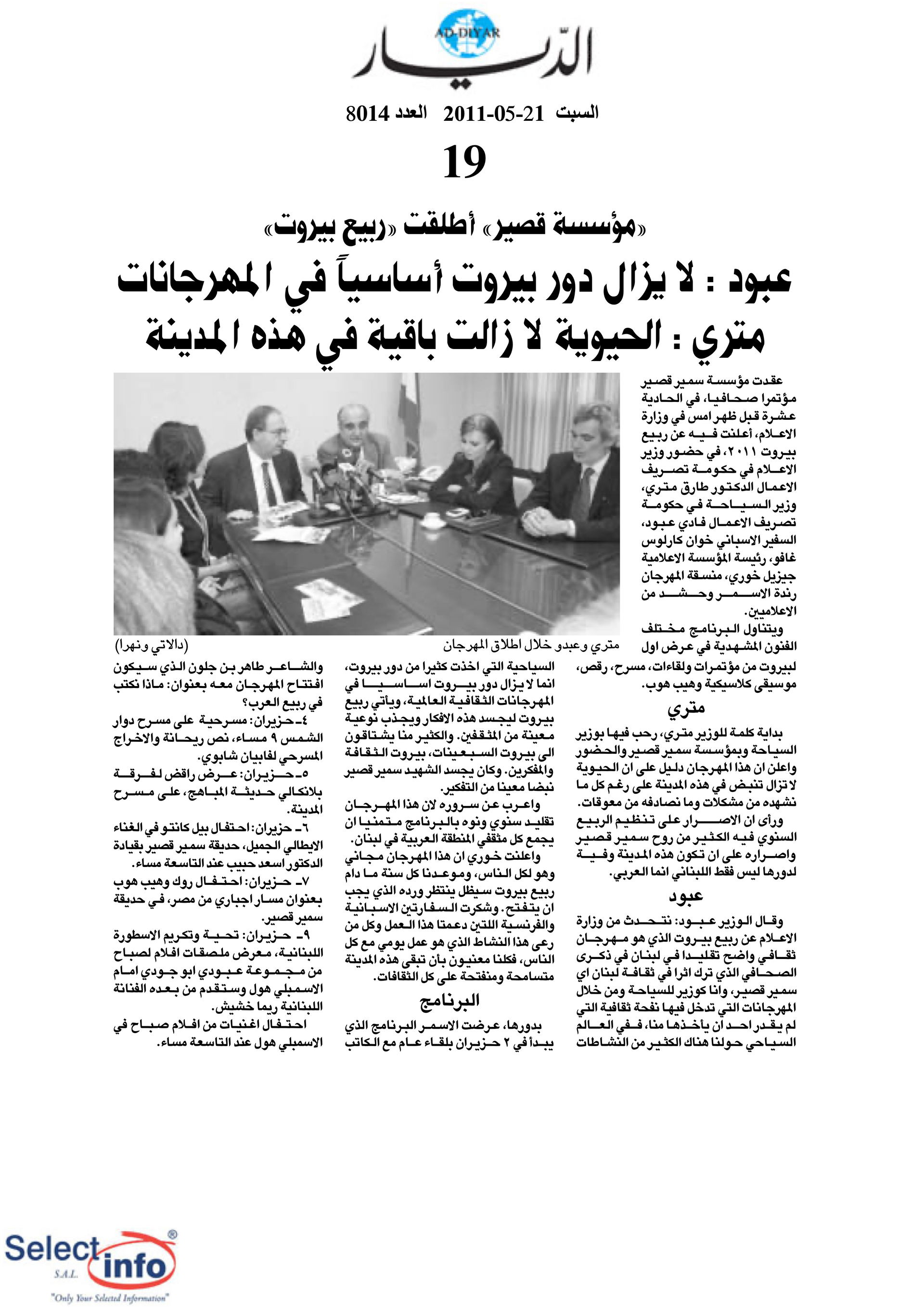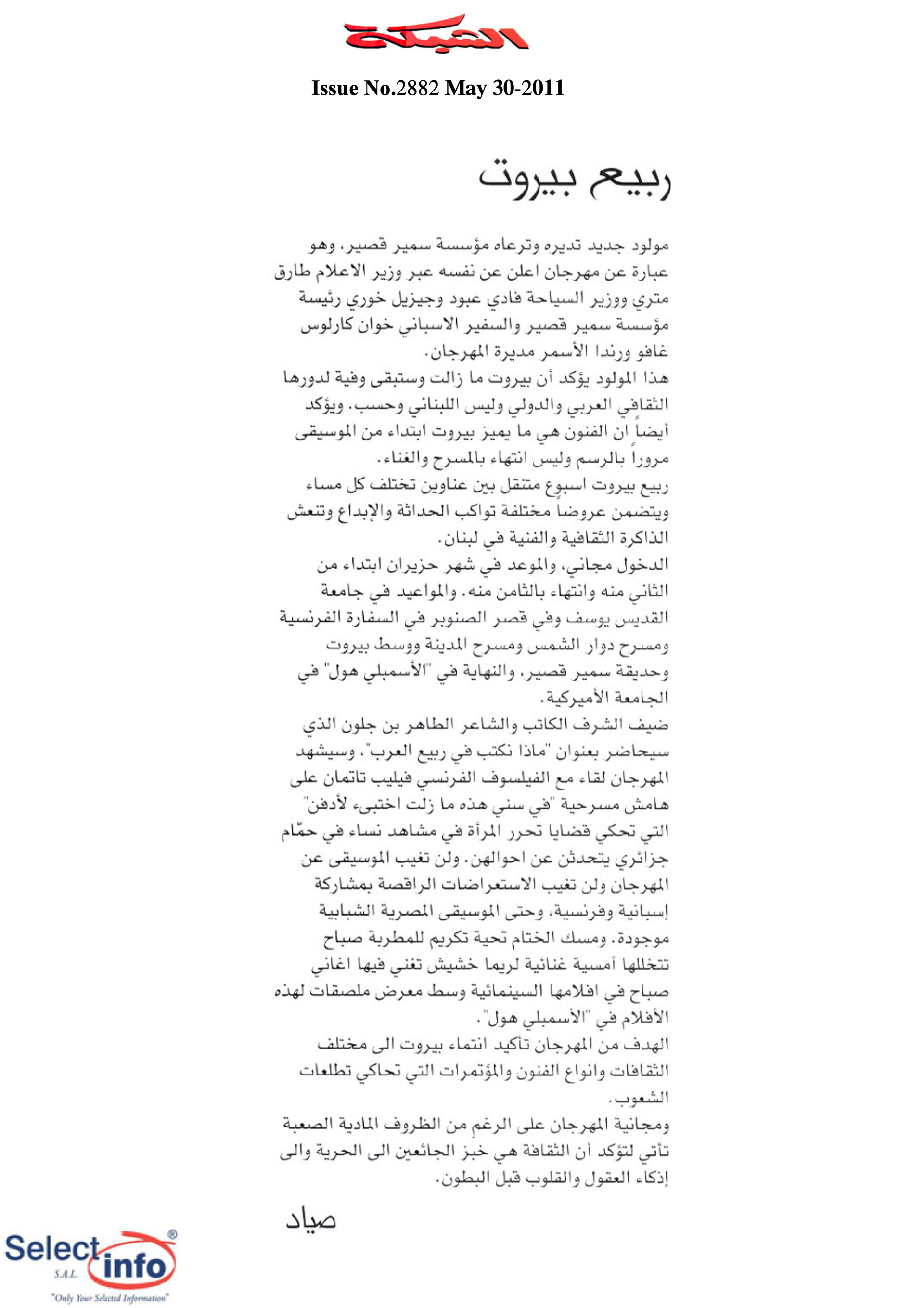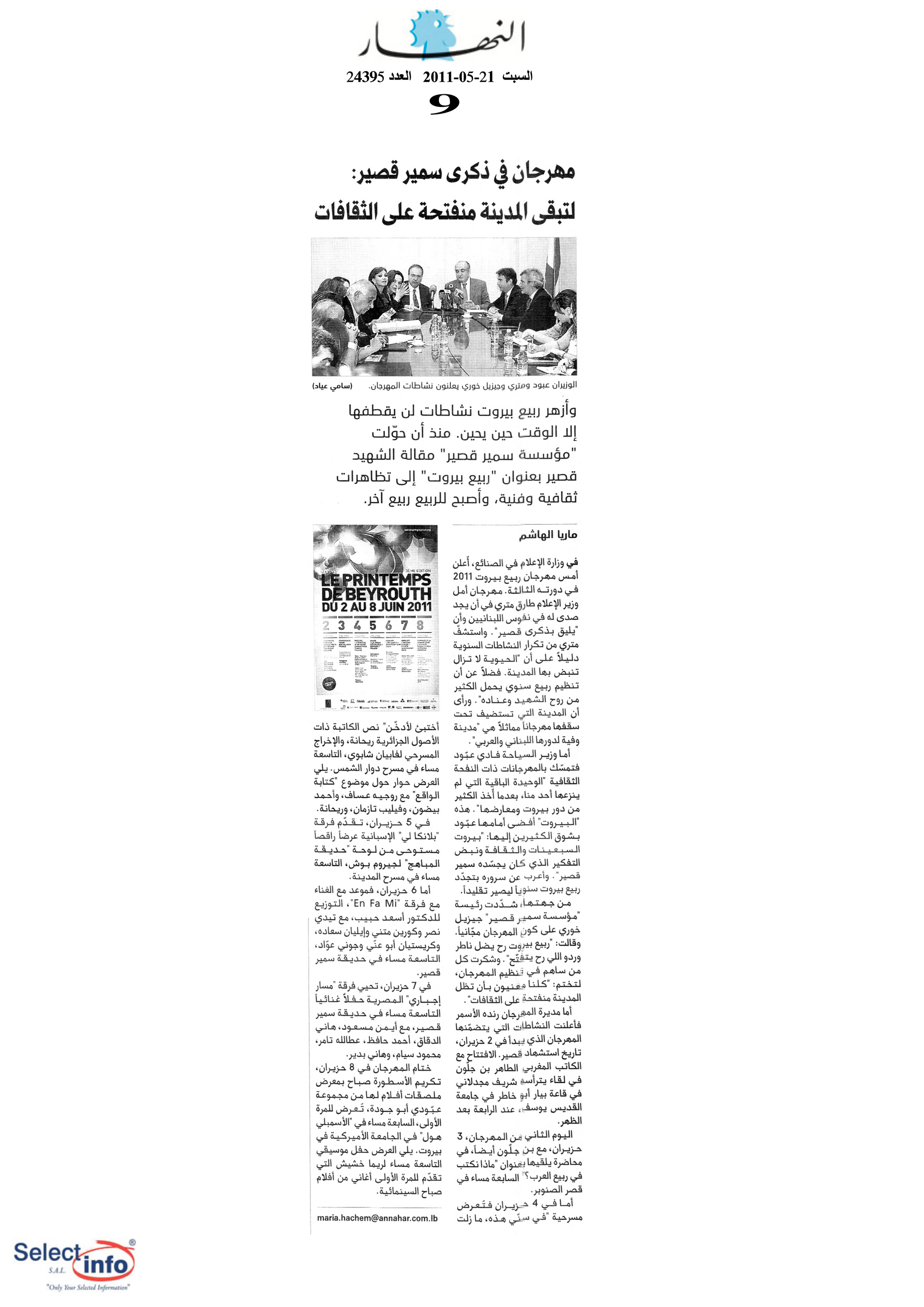 The third edition of the Beirut Spring Festival took place from 2 to 8 June 2011. Produced by the Samir Kassir Foundation, the Festival presented a seven-day program featuring discussions, theatre, dance, concerts, and a tribute to Lebanese singer Sabah. This third edition remained free of charge, and gathered talent from Lebanon, France, Algeria, Spain, Morocco, and Egypt. It took place in a variety of indoor and outdoor locations (theatre halls, university halls and public spaces) thanks to the support of 22 partners and the extensive coverage of the press.