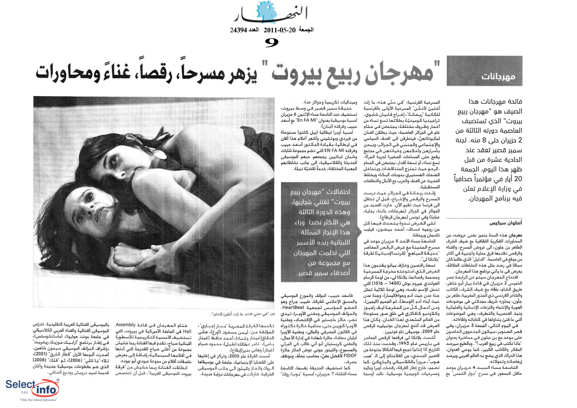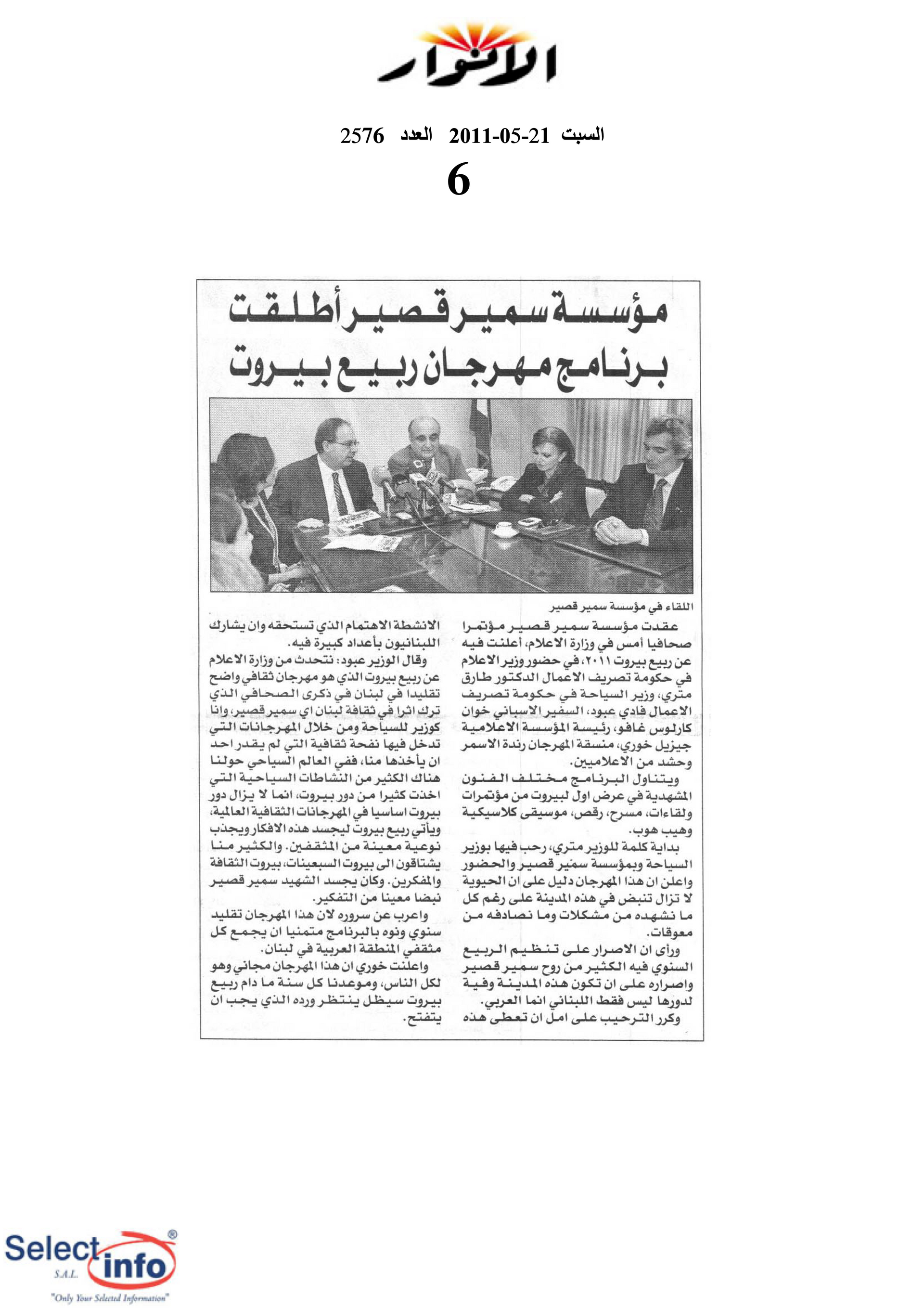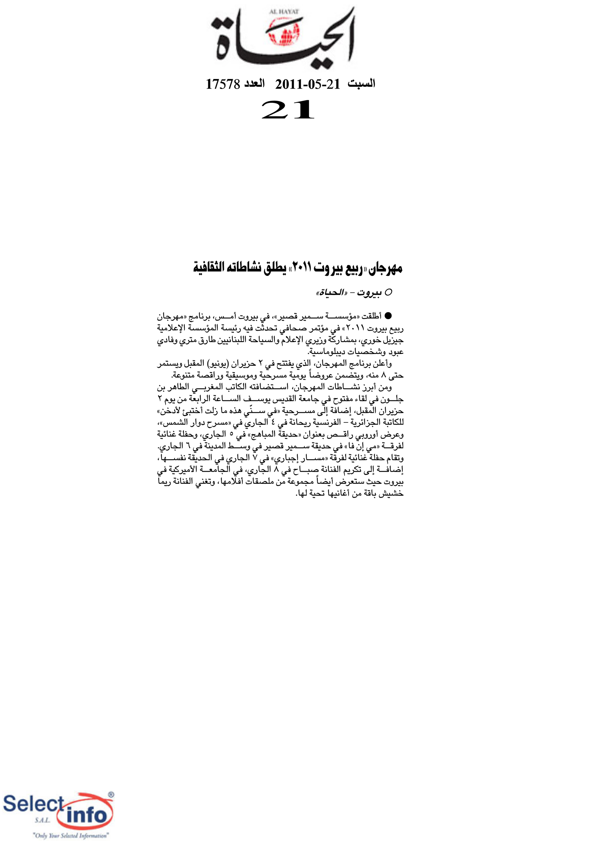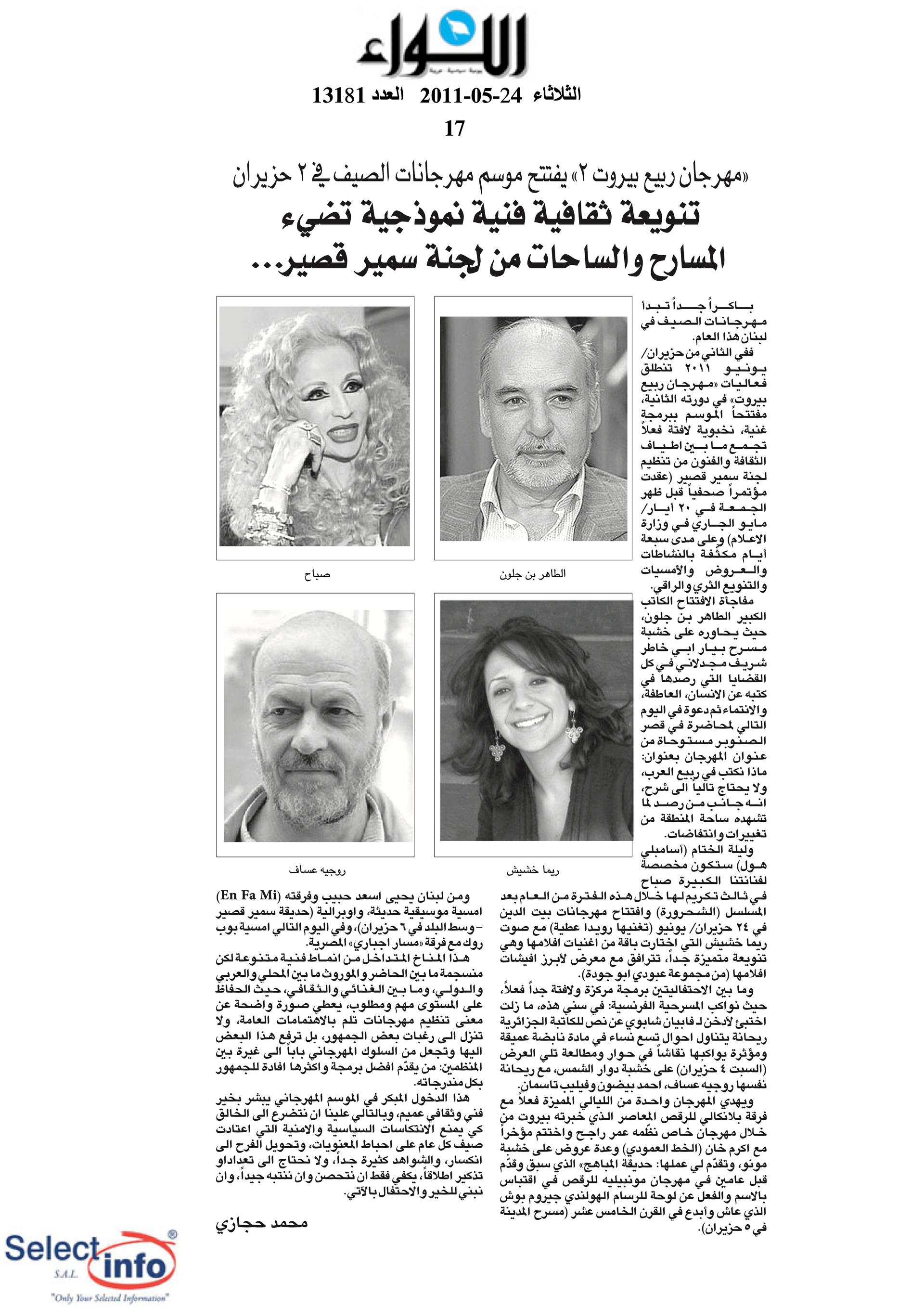 The third edition of the Beirut Spring Festival took place from 2 to 8 June 2011. Produced by the Samir Kassir Foundation, the Festival presented a seven-day program featuring discussions, theatre, dance, concerts, and a tribute to Lebanese singer Sabah. This third edition remained free of charge, and gathered talent from Lebanon, France, Algeria, Spain, Morocco, and Egypt. It took place in a variety of indoor and outdoor locations (theatre halls, university halls and public spaces) thanks to the support of 22 partners and the extensive coverage of the press.