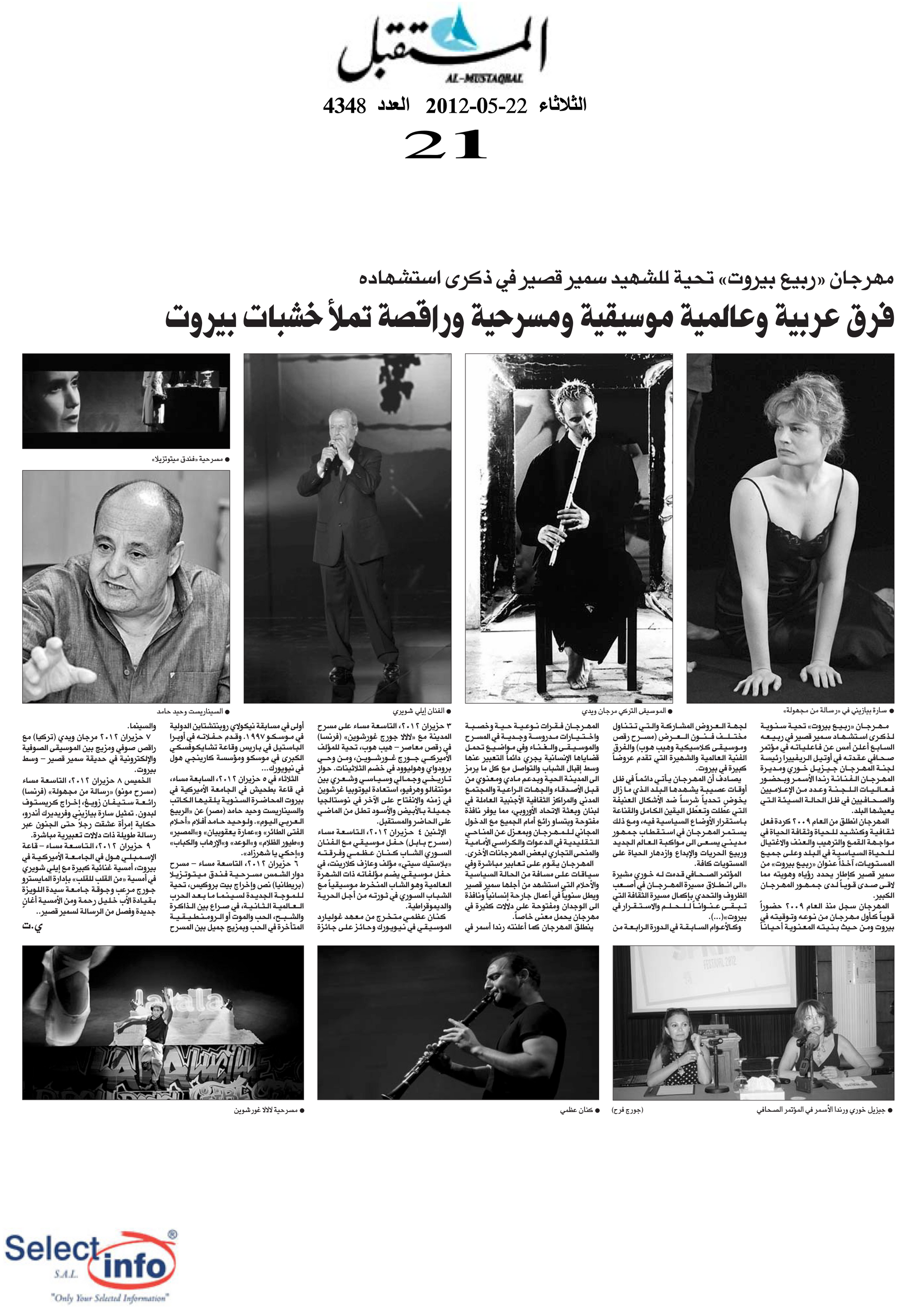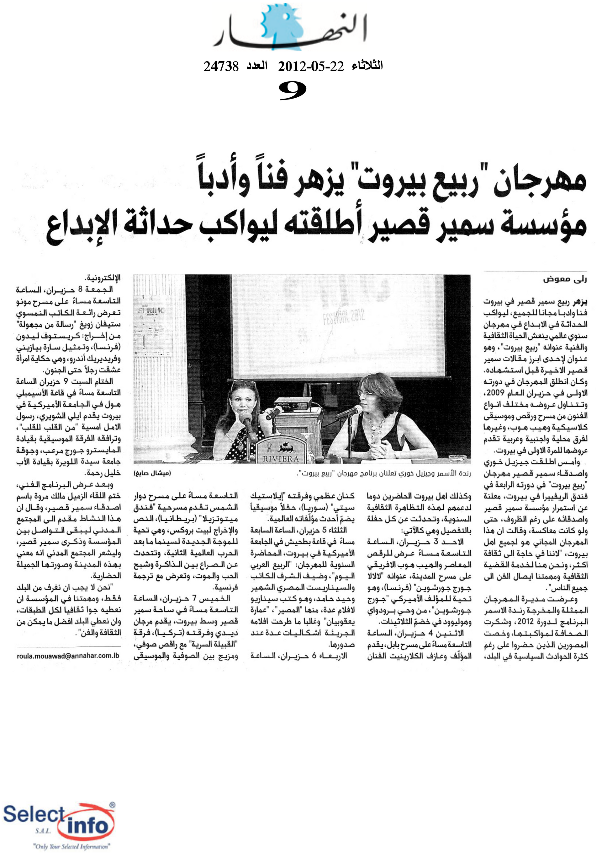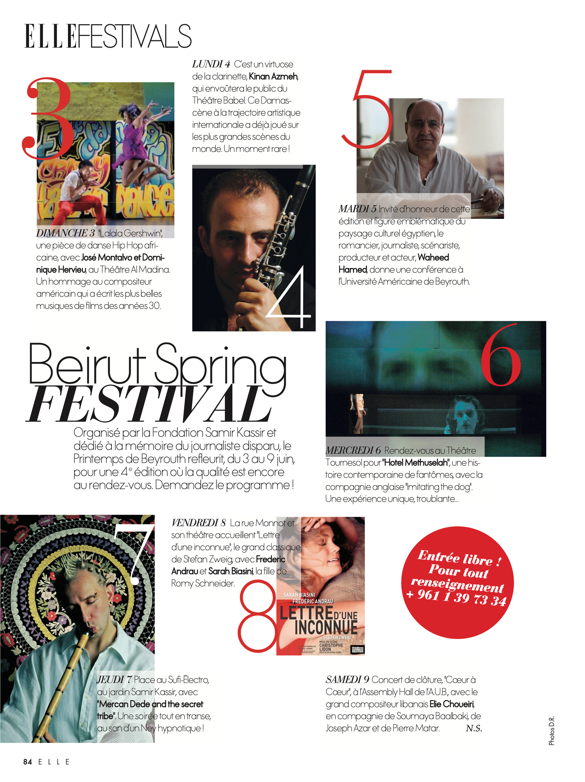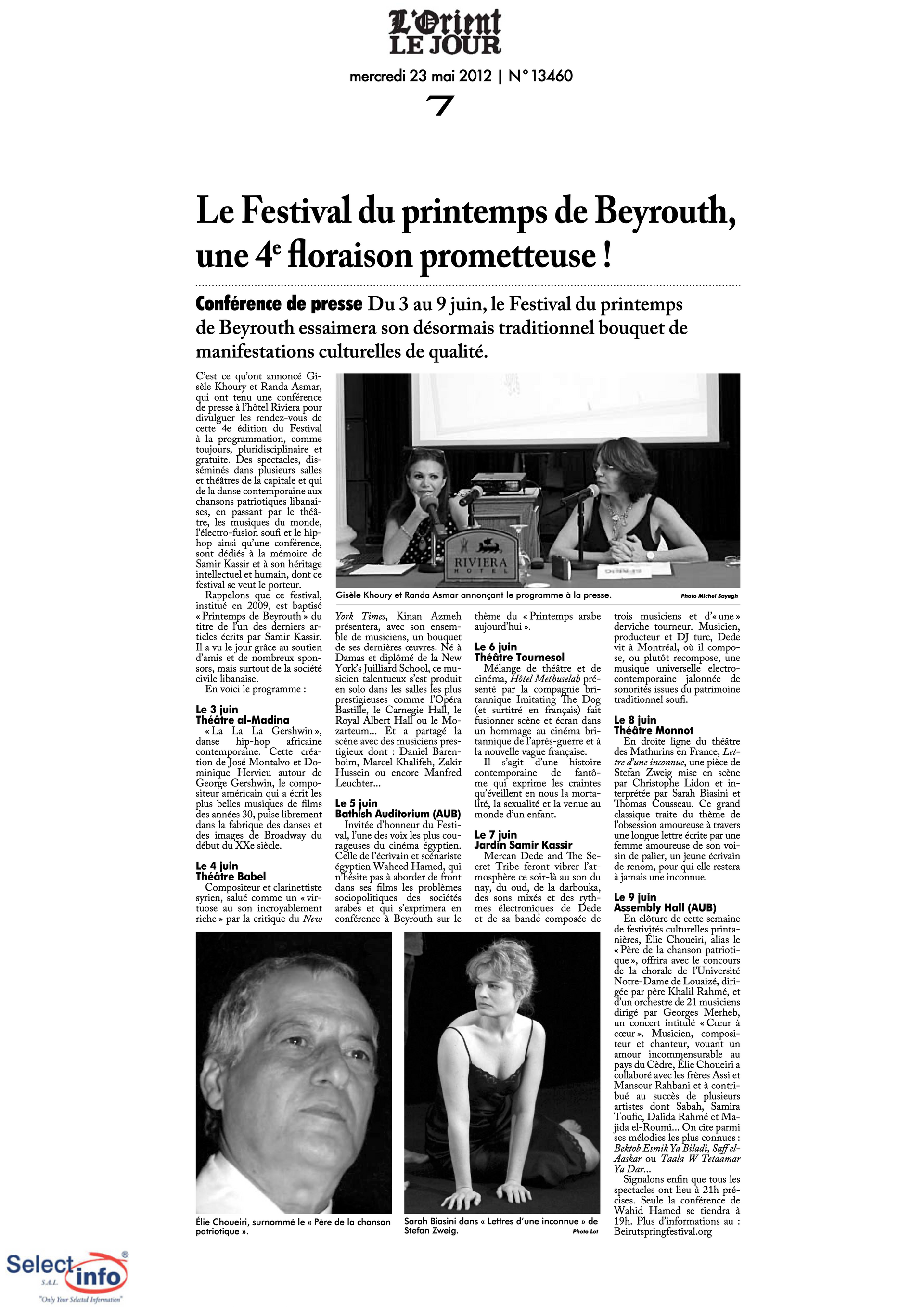 The fourth edition of the Beirut Spring Festival took place from 3 to 9 June 2012. Produced by the Samir Kassir Foundation, the Festival presented a seven-day program featuring a lecture, a multimedia dance performance, a theatre play, a cinema-theatre, two concerts, and a tribute to Lebanese singer Elie Choueiri. This fourth edition remained free of charge, and gathered talent from Lebanon, France, Syria, Egypt, the United Kingdom and Turkey. It took place in a variety of indoor and outdoor locations (theatre halls, university halls and public spaces) thanks to the support of 20 partners and the extensive coverage of the press.