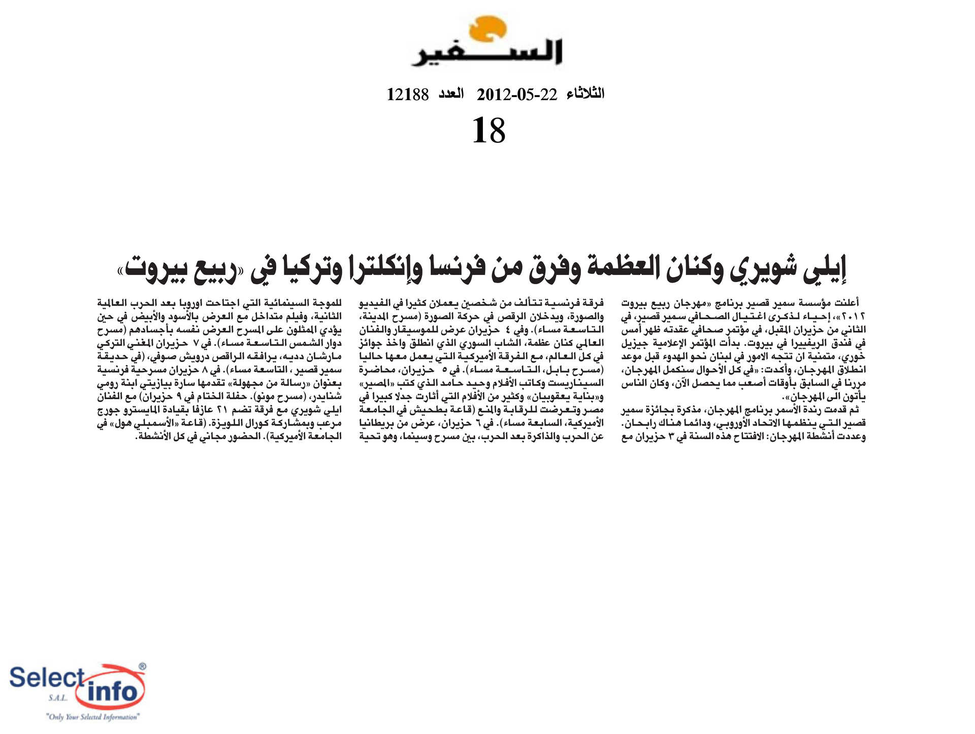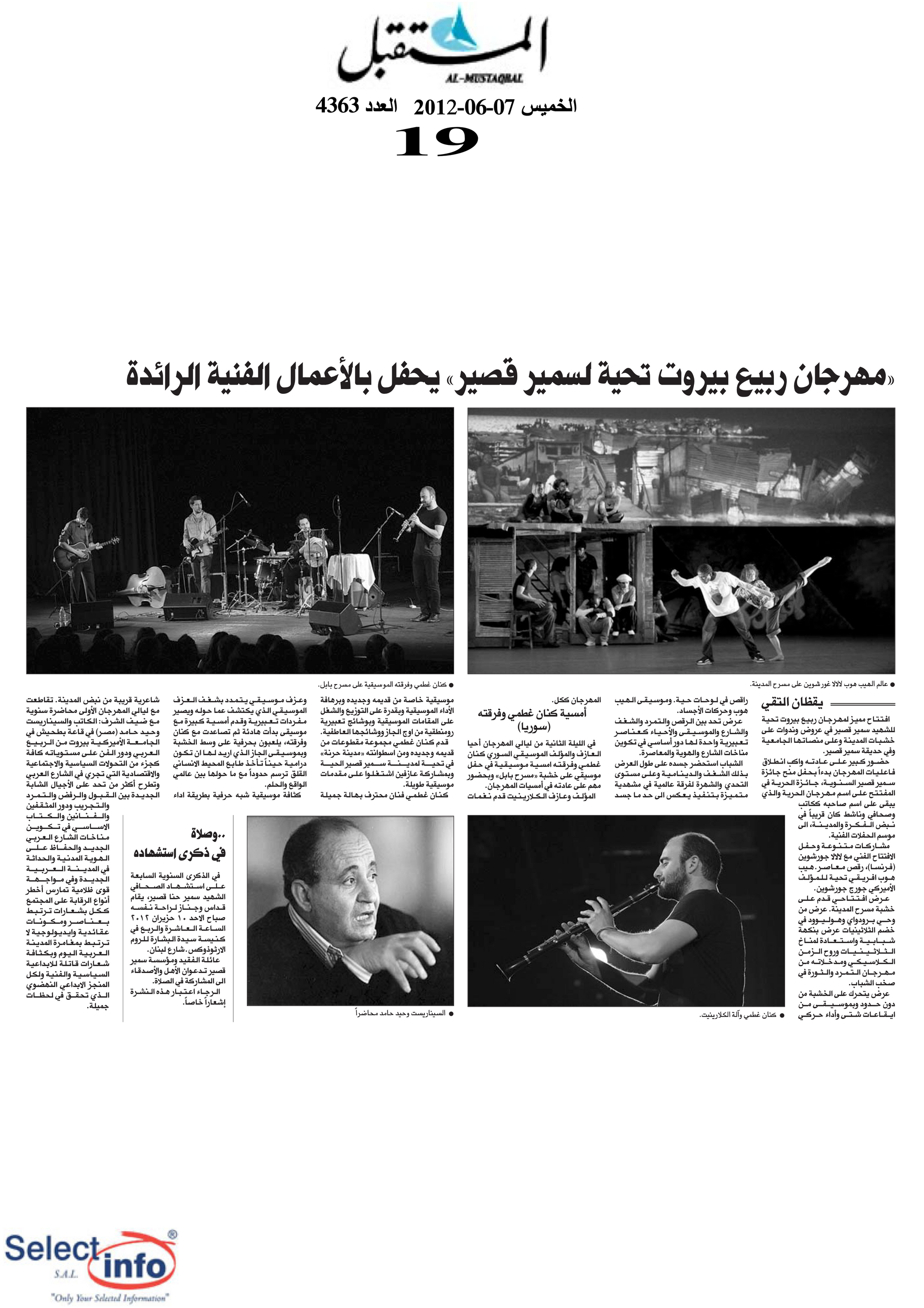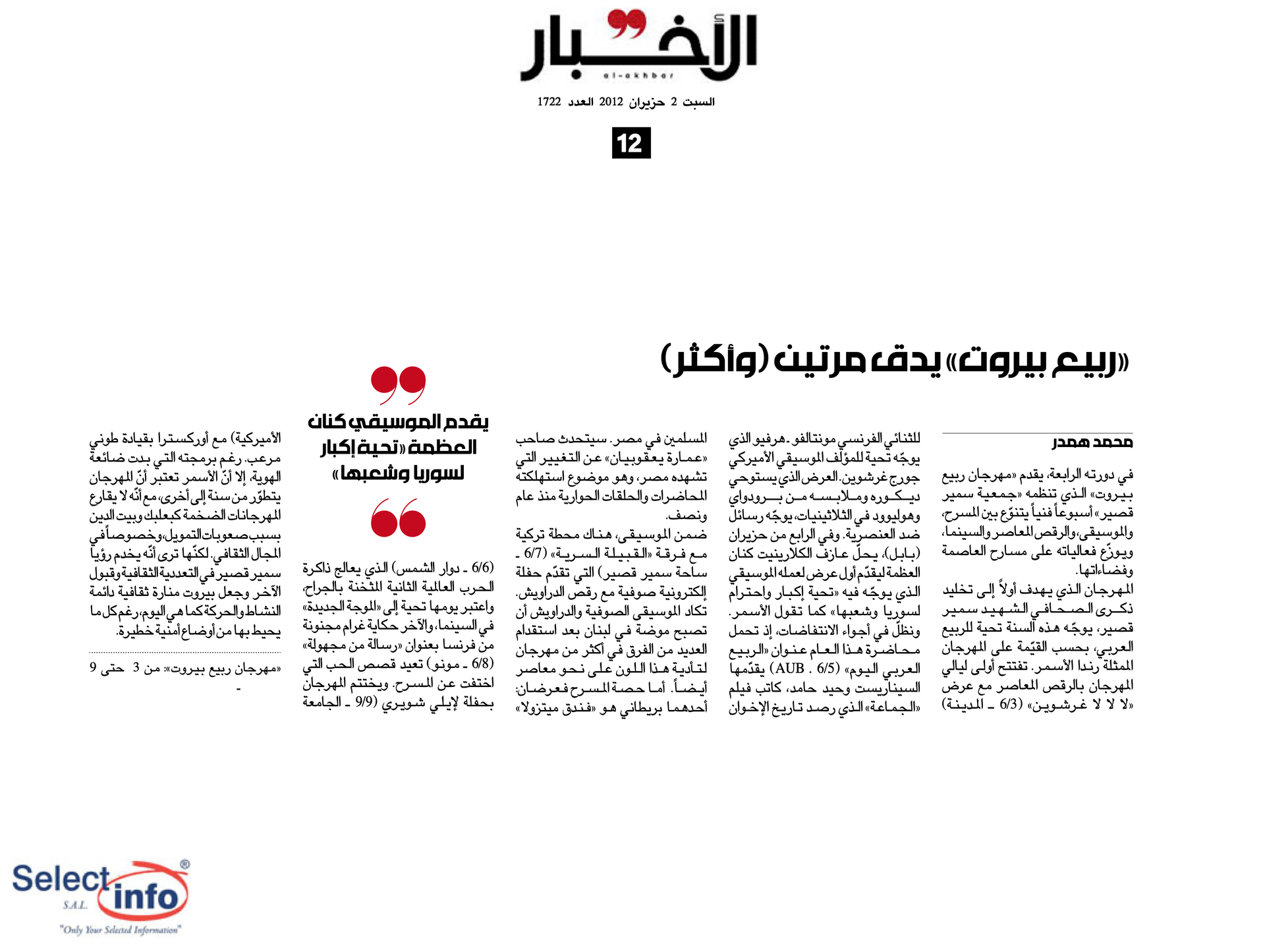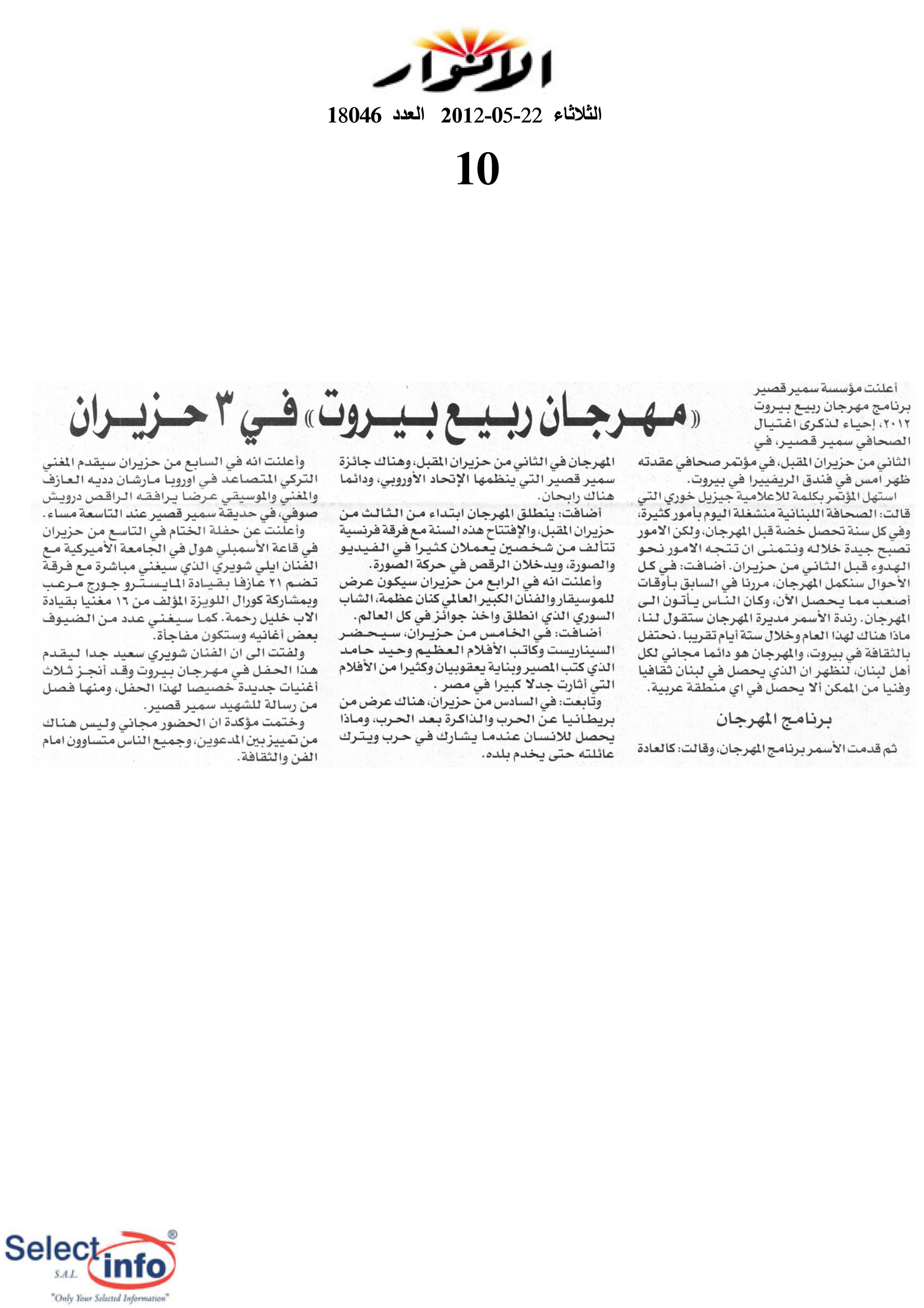 The fourth edition of the Beirut Spring Festival took place from 3 to 9 June 2012. Produced by the Samir Kassir Foundation, the Festival presented a seven-day program featuring a lecture, a multimedia dance performance, a theatre play, a cinema-theatre, two concerts, and a tribute to Lebanese singer Elie Choueiri. This fourth edition remained free of charge, and gathered talent from Lebanon, France, Syria, Egypt, the United Kingdom and Turkey. It took place in a variety of indoor and outdoor locations (theatre halls, university halls and public spaces) thanks to the support of 20 partners and the extensive coverage of the press.