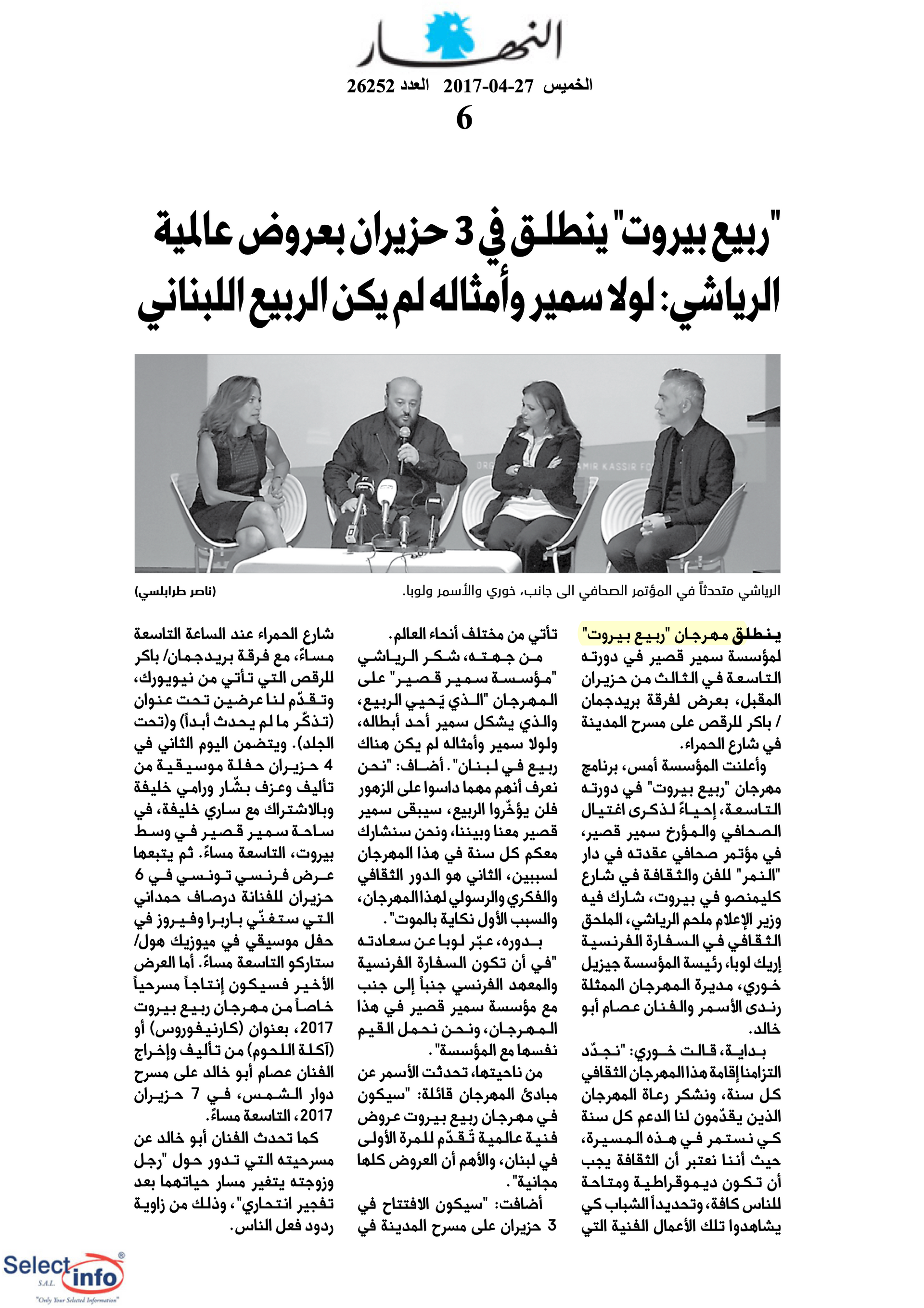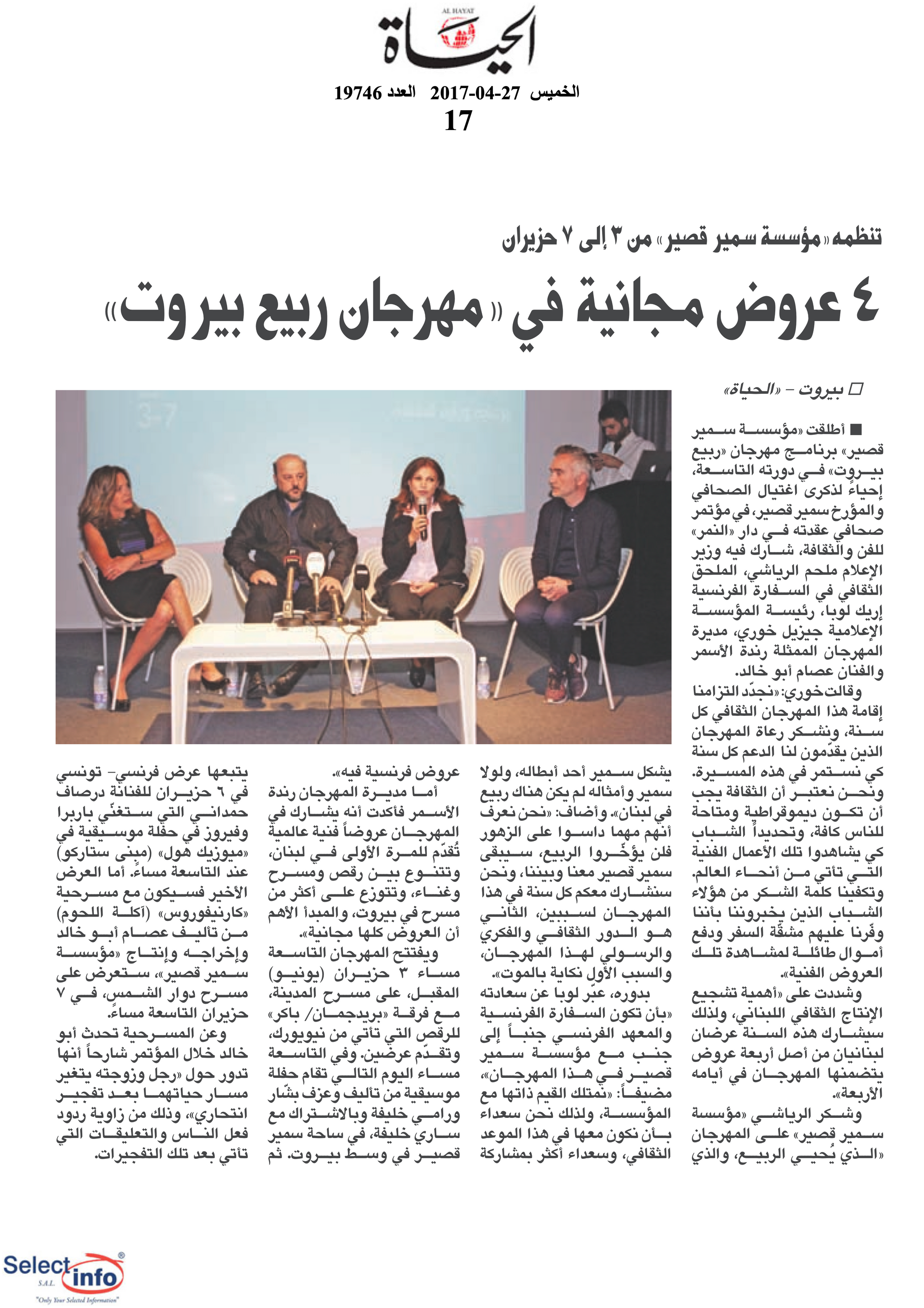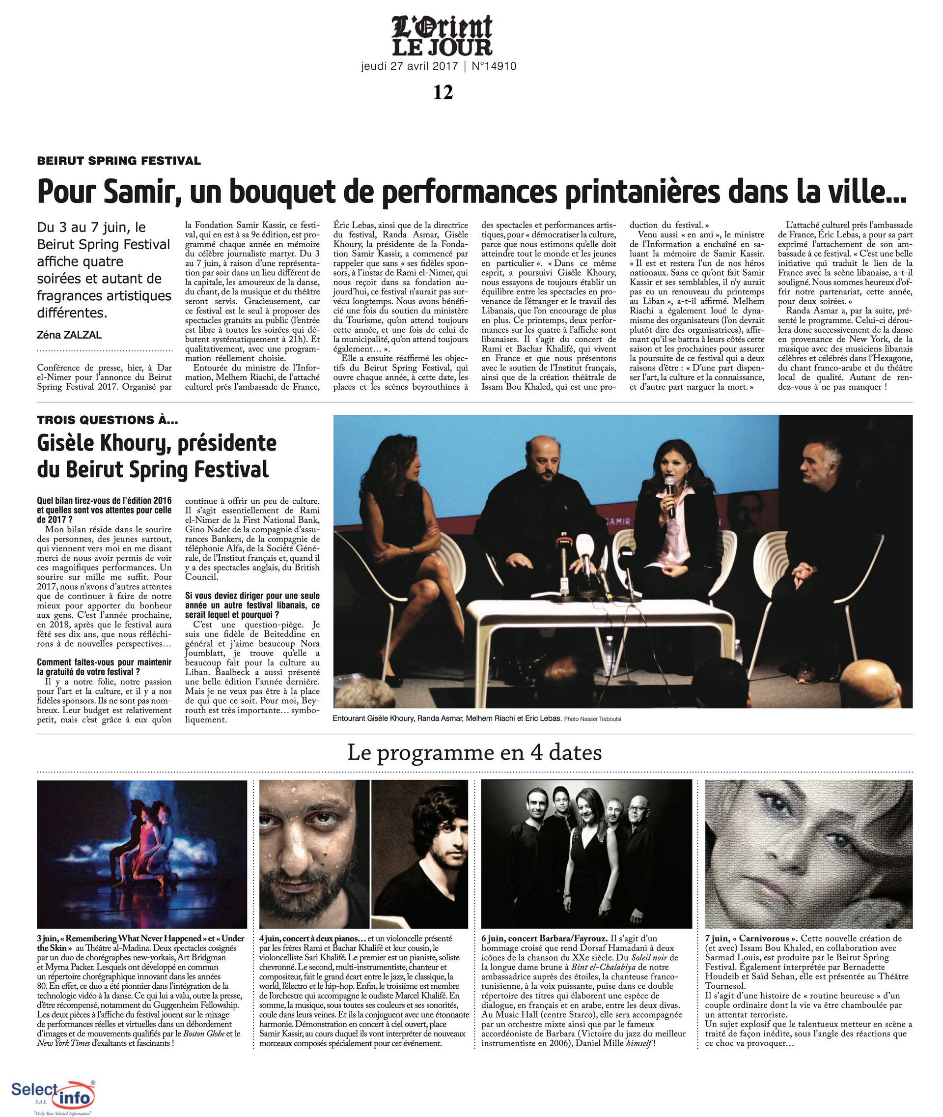 The ninth edition of the Beirut Spring Festival took place between 3 and 7 June 2017. Produced by the Samir Kassir Foundation with the contribution of sponsors, the festival featured a dance performance, a piano concert, a singing concert and a theatre play, gathering talent from Lebanon, the United States of America, France and Tunisia, in indoor