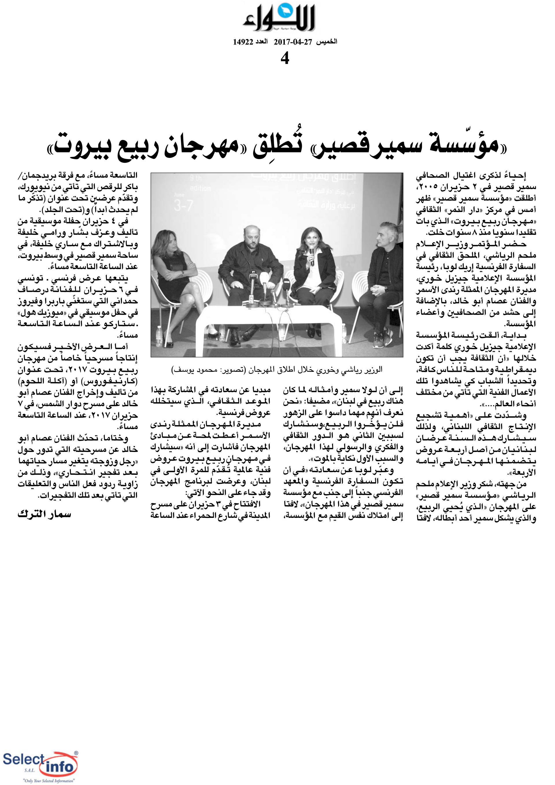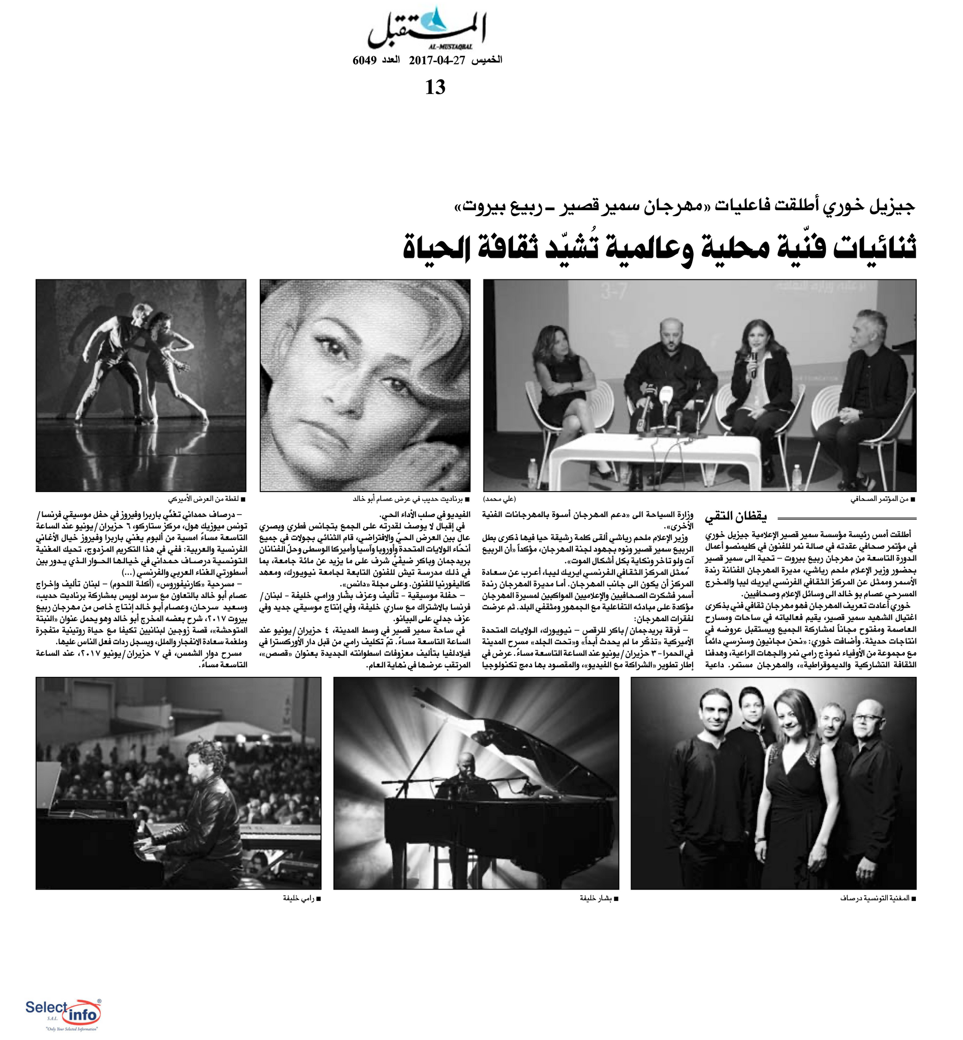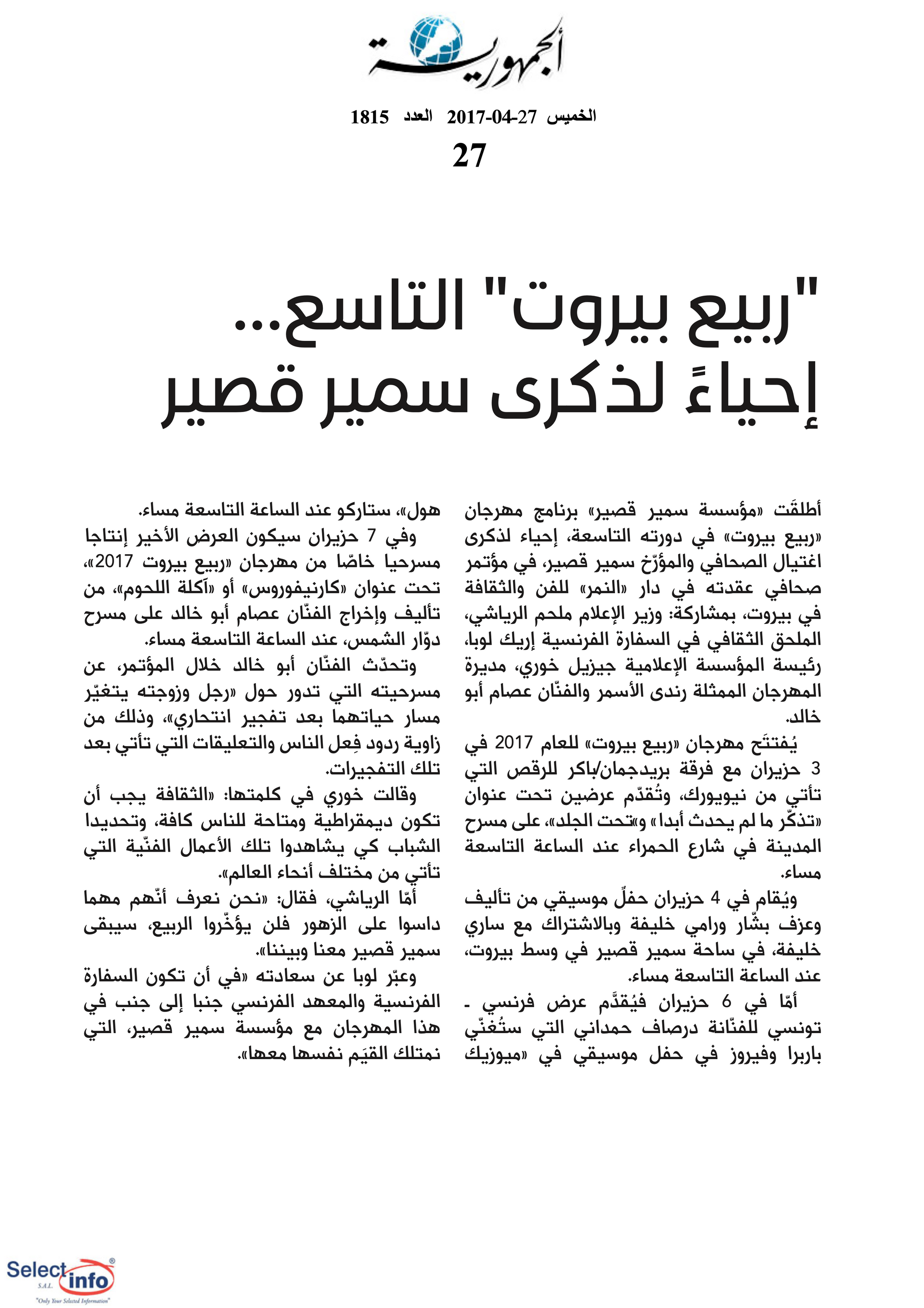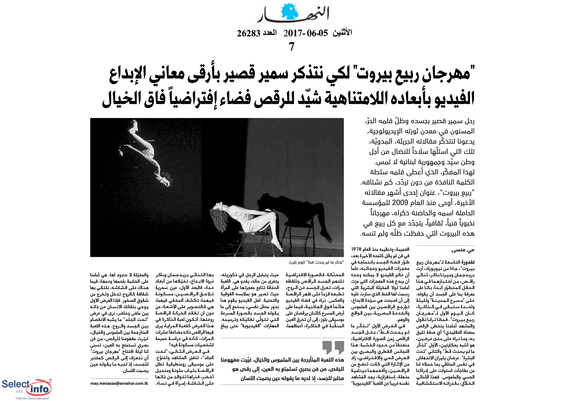 The ninth edition of the Beirut Spring Festival took place between 3 and 7 June 2017. Produced by the Samir Kassir Foundation with the contribution of sponsors, the festival featured a dance performance, a piano concert, a singing concert and a theatre play, gathering talent from Lebanon, the United States of America, France and Tunisia, in indoor