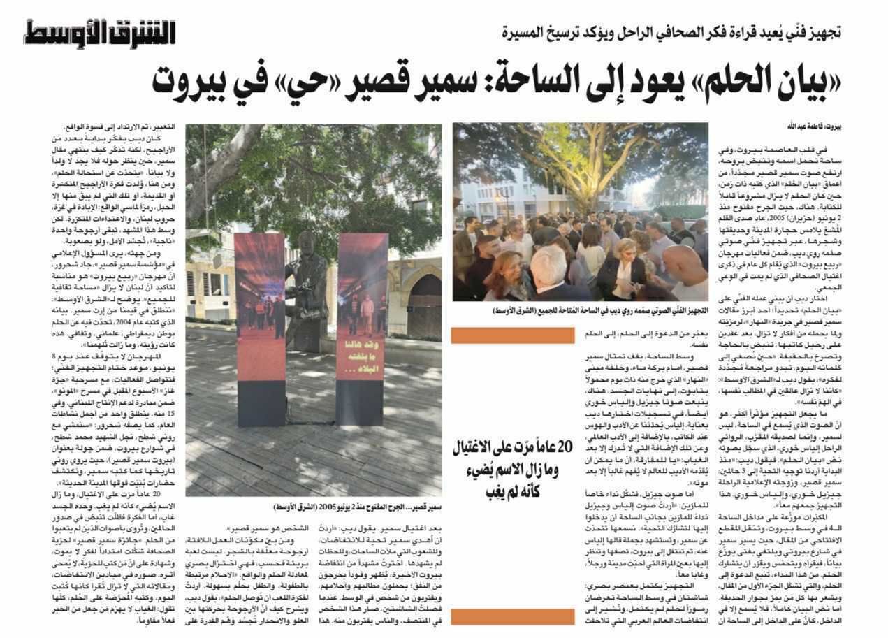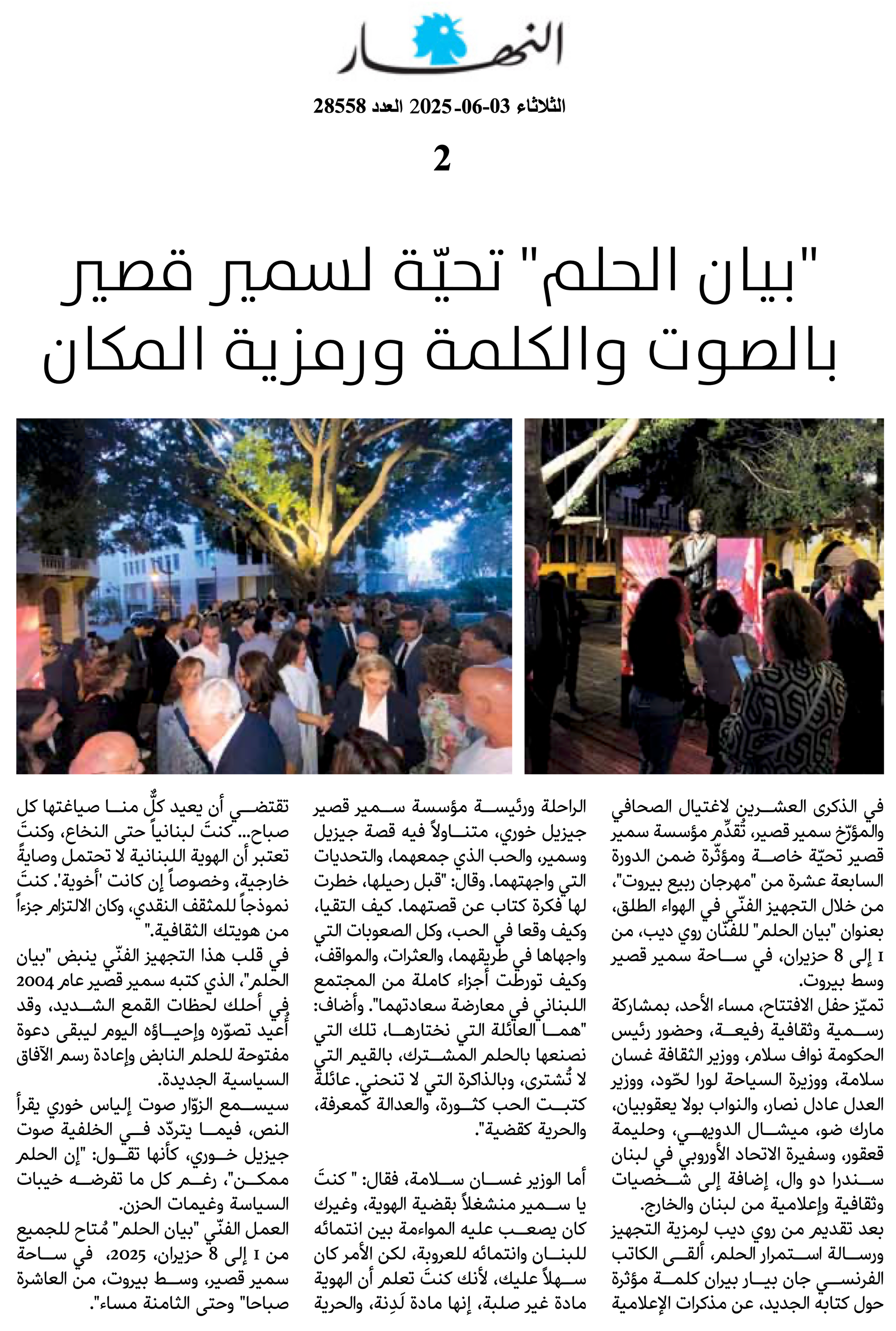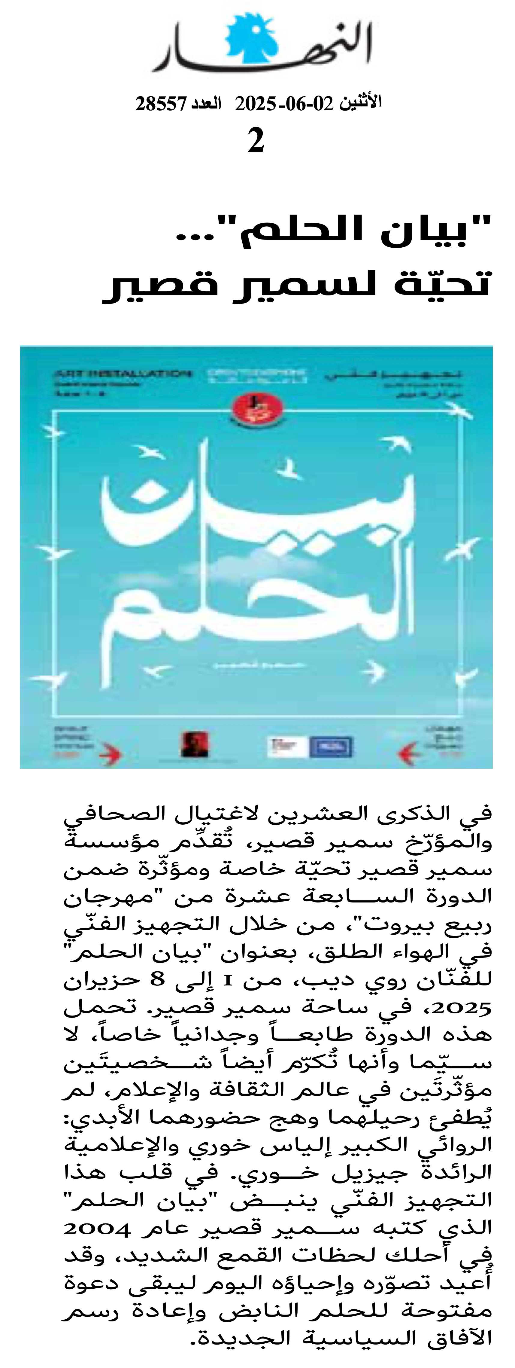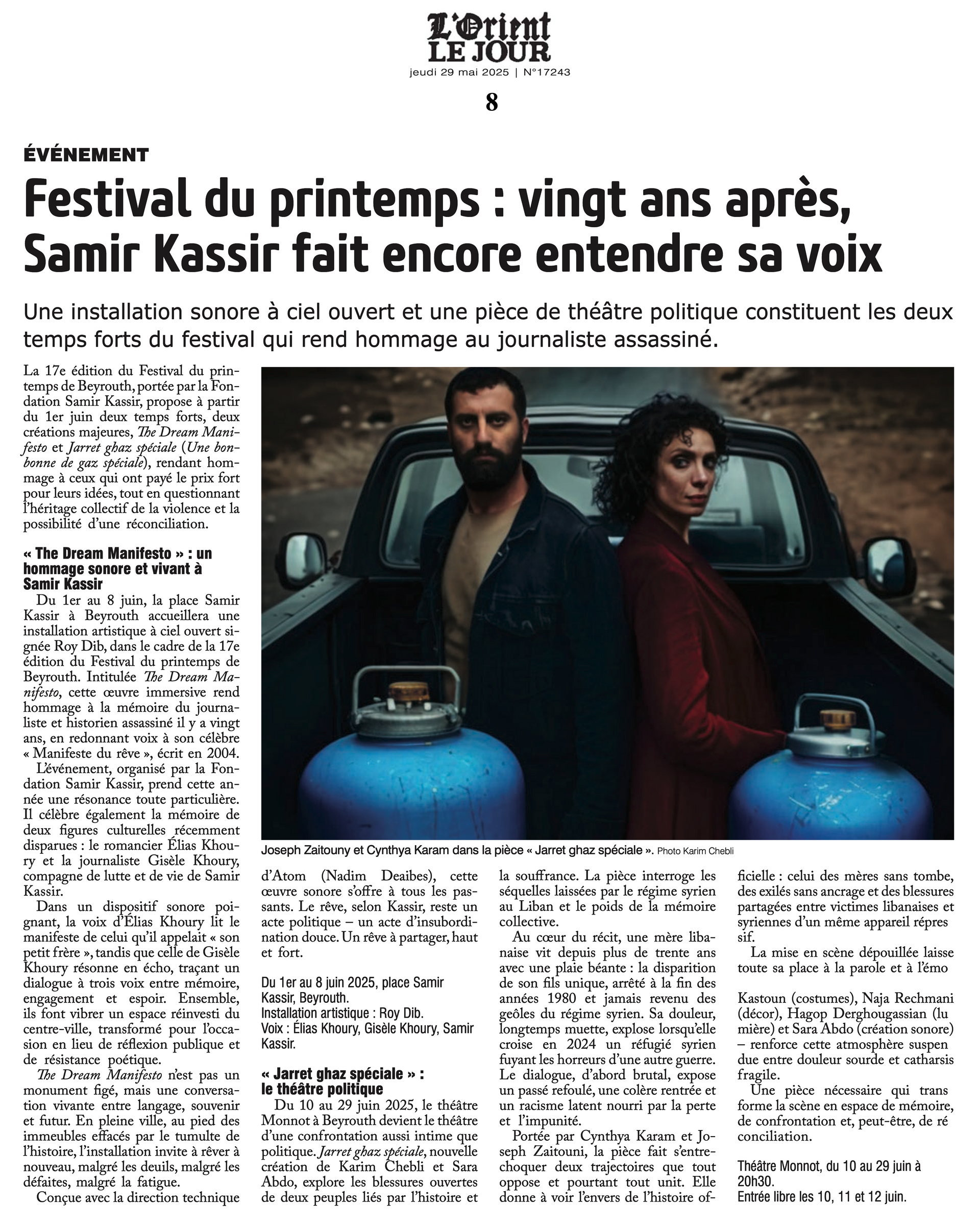 The 17th edition of the Beirut Spring Festival marks 20 years on the assassination of Samir Kassir. Scheduled for 1 – 21 June 2025, the festival features a public art installation, a theatre production, and a walking tour. The art installation, titled “Bayan El Helm”, takes place in Samir Kassir Square, Beirut Downtown, from 1 to 8 June, and the play "Jarret Ghaz Spéciale" runs from 10 to 29 June at the Monnot Theatre. On 15 June, a street promenade honors the history, memory, freedom, and the soul of Samir Kassir's Beirut. In keeping with the festival’s tradition, the installation and the walking tour are free, as well as the first three nights of the play, thanks to the support of nine partner organizations, and the fundraiser play "Contractions". The theatre evenings from 13 to 29 June are paid ticketed events. At the end of the summer, the festival presented "20 Years for Freedom," an exhibition featuring the work of eight Lebanese photojournalists who have documented Lebanon's struggles, hopes, and defining moments since 2005. The exhibition was supported by the Royal Norwegian Embassy in Beirut.