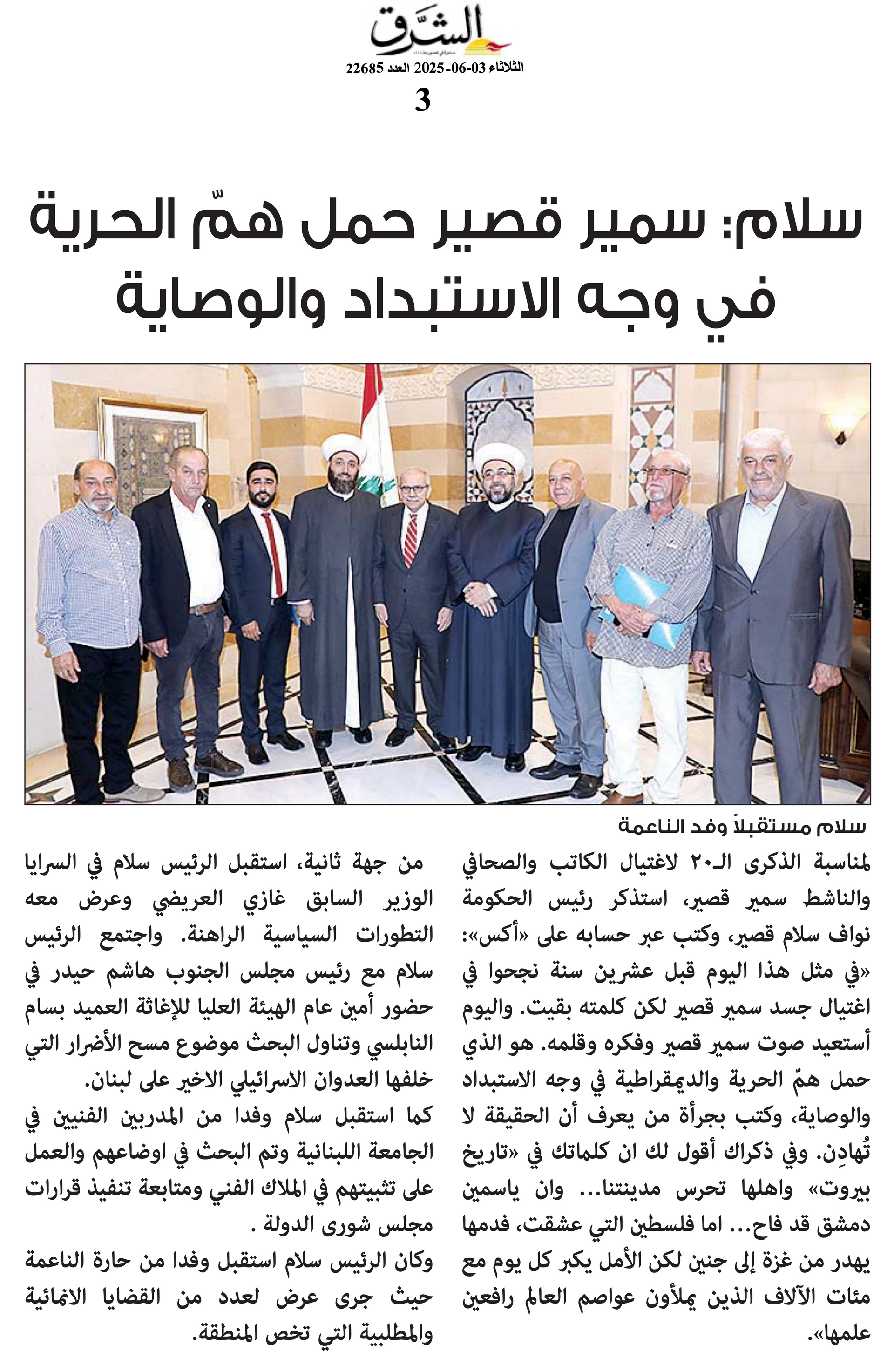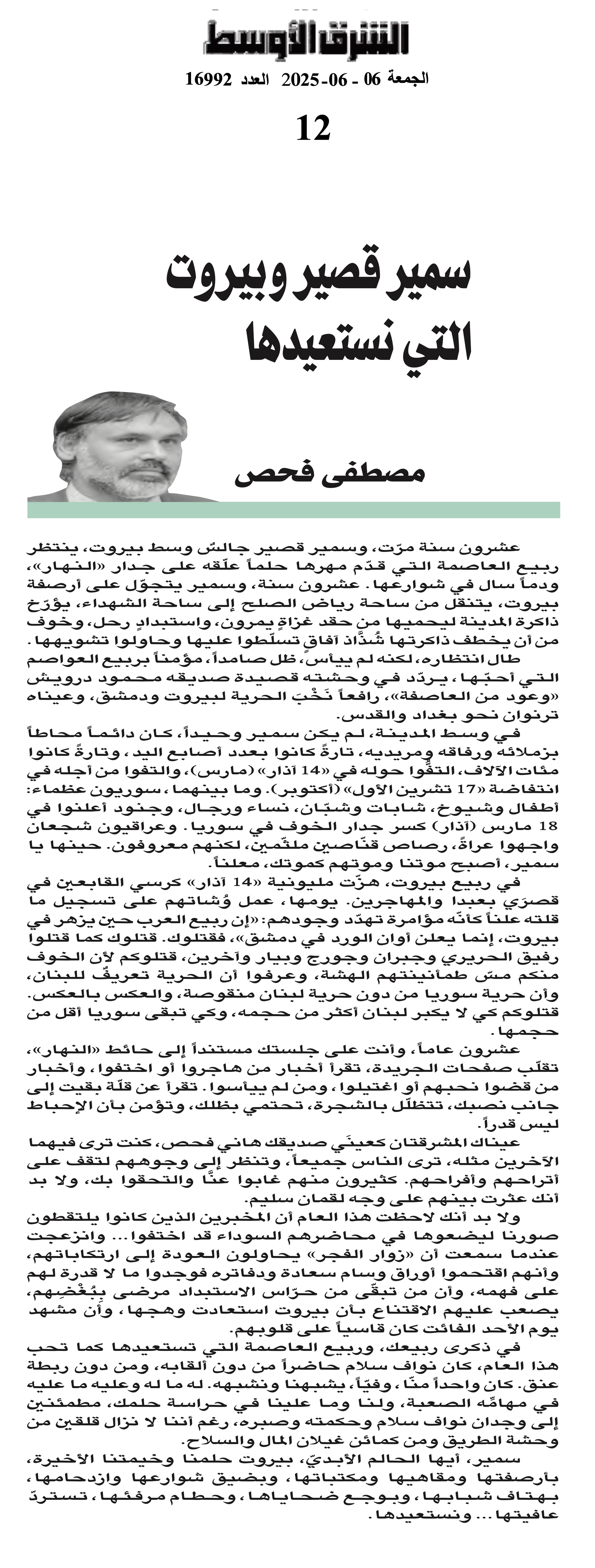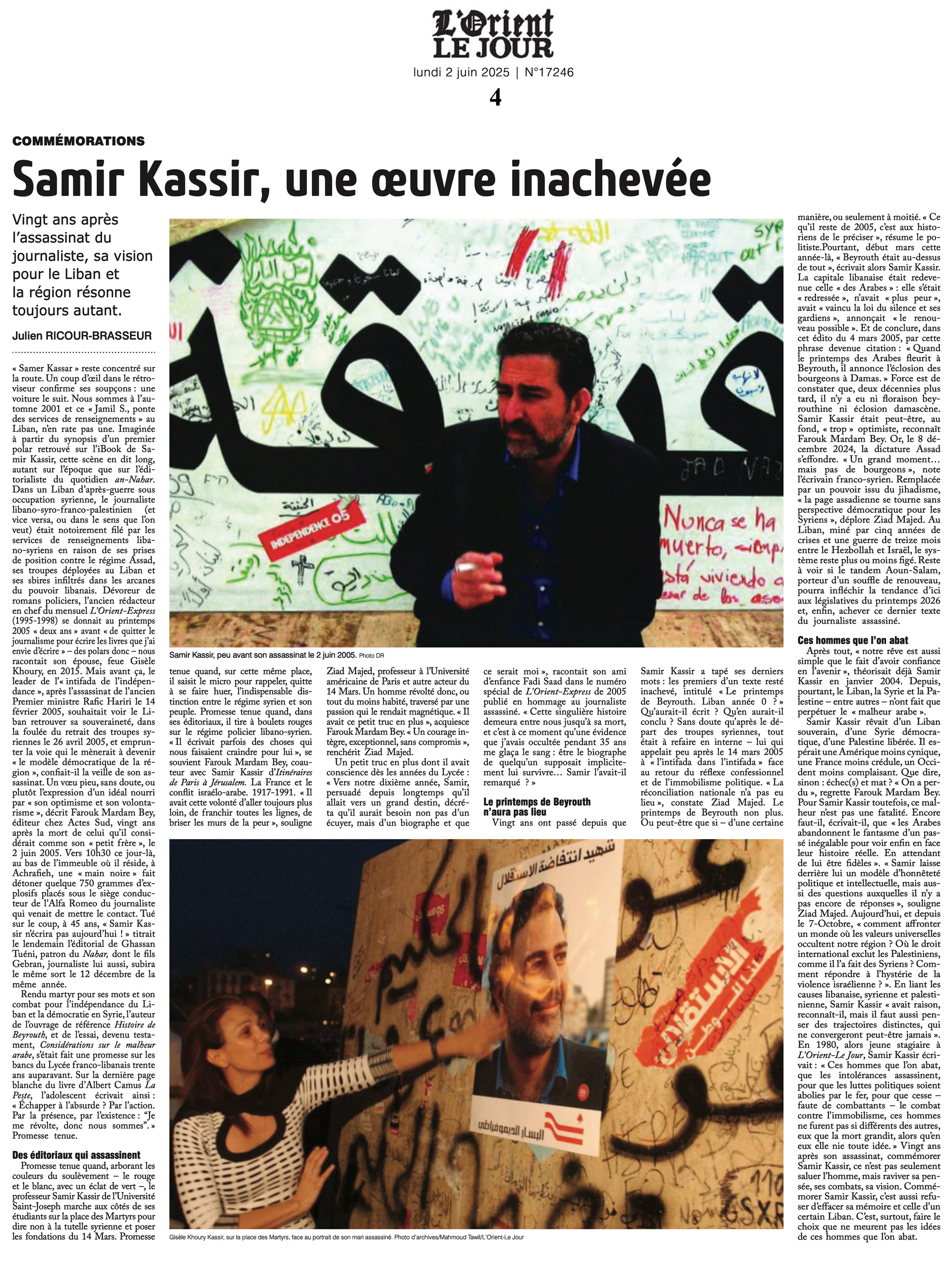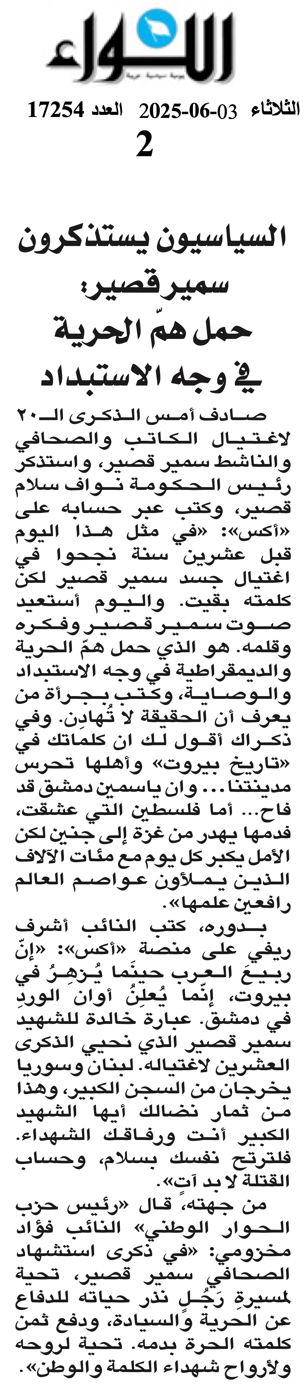 The 17th edition of the Beirut Spring Festival marks 20 years on the assassination of Samir Kassir. Scheduled for 1 – 21 June 2025, the festival features a public art installation, a theatre production, and a walking tour. The art installation, titled “Bayan El Helm”, takes place in Samir Kassir Square, Beirut Downtown, from 1 to 8 June, and the play "Jarret Ghaz Spéciale" runs from 10 to 29 June at the Monnot Theatre. On 15 June, a street promenade honors the history, memory, freedom, and the soul of Samir Kassir's Beirut. In keeping with the festival’s tradition, the installation and the walking tour are free, as well as the first three nights of the play, thanks to the support of nine partner organizations, and the fundraiser play "Contractions". The theatre evenings from 13 to 29 June are paid ticketed events. At the end of the summer, the festival presented "20 Years for Freedom," an exhibition featuring the work of eight Lebanese photojournalists who have documented Lebanon's struggles, hopes, and defining moments since 2005. The exhibition was supported by the Royal Norwegian Embassy in Beirut.