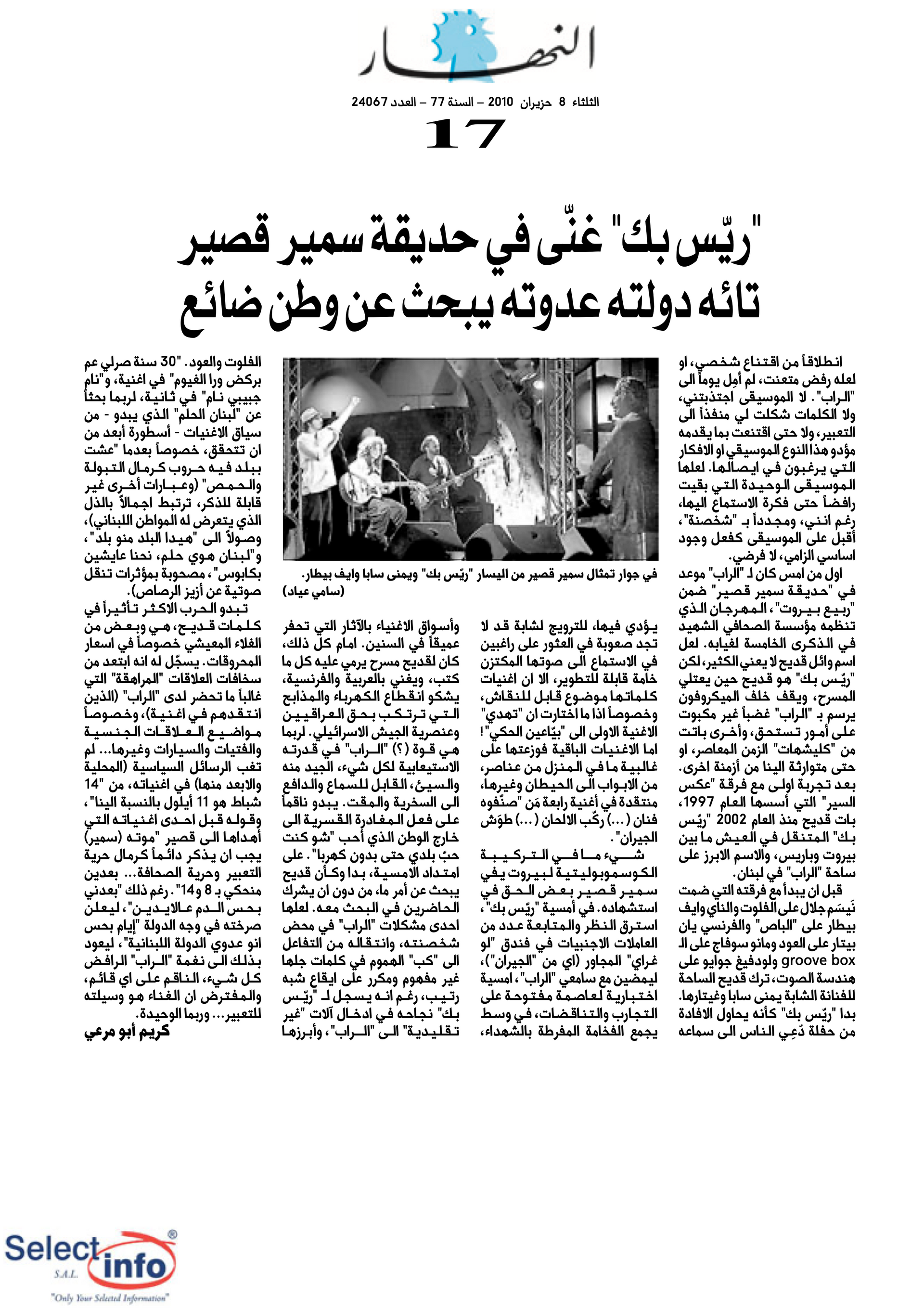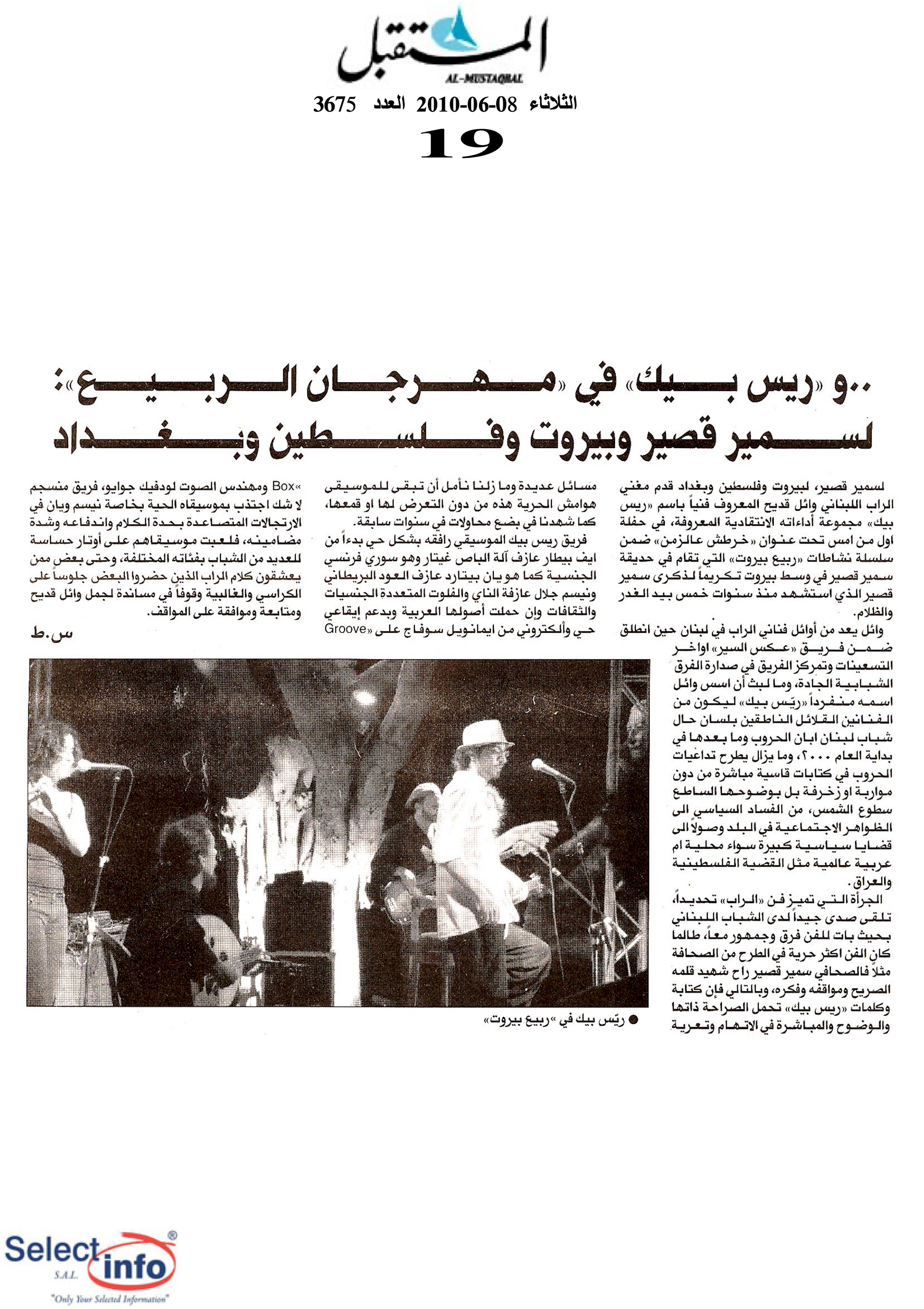 2011-2012: the Marsatac Festival has asked several artists to create a collective, Mix up Beyrouth, among them: Rodolphe Burger, leader of the Kat Onoma group and friend of Alain Bashung, Frédéric Nevchehirlian, Rayess Bek, Ziad Saad, Fadi Tabbal, Julien Perraudeau, Youmna Saba and Abed Kobeissy. The purpose of this collective is to release a “Harmonia Mundi/Acte Sud” album in 2012. This collective has already performed several concerts in France.