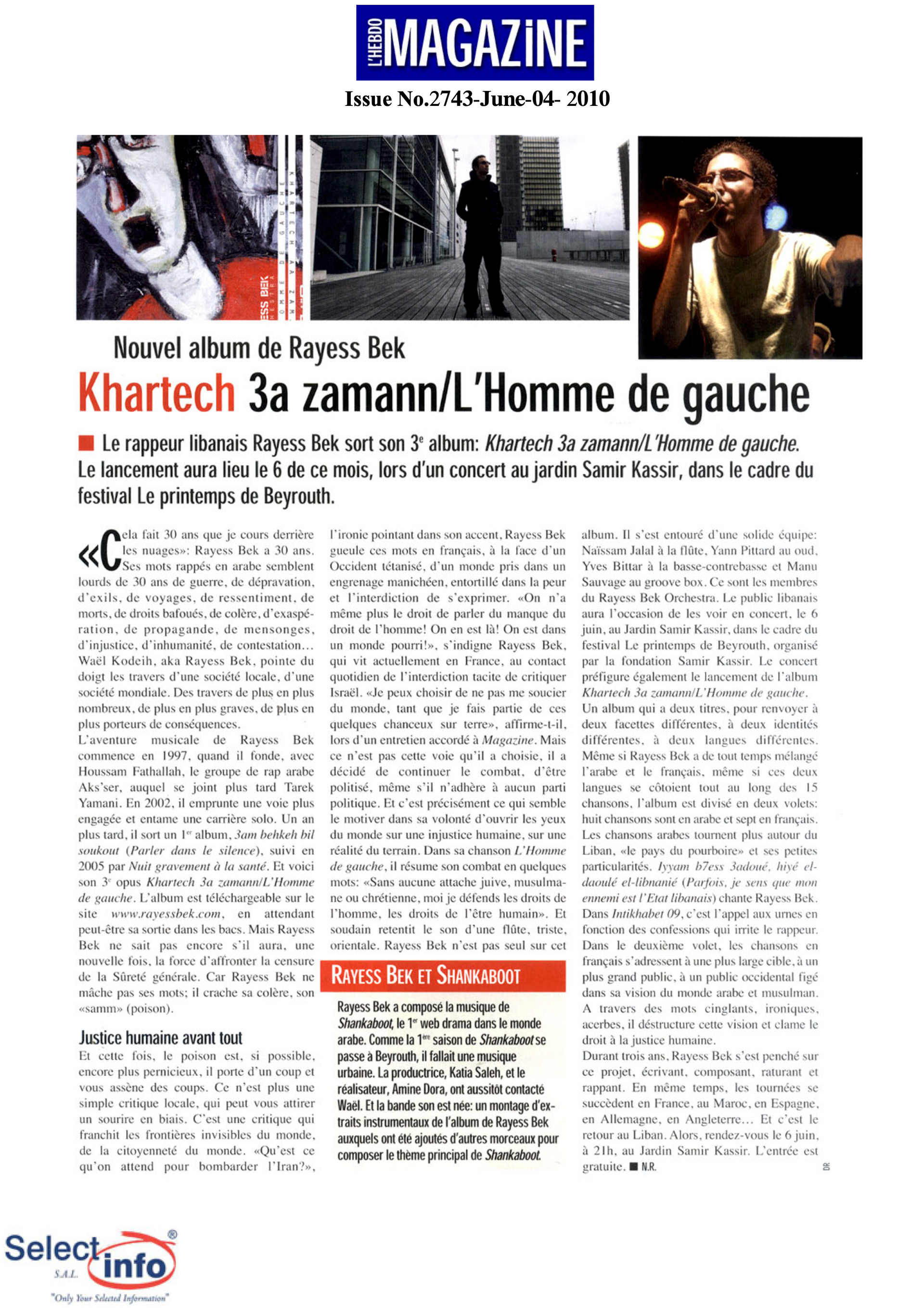 In the end of 2010, Dash Art, a contemporary art association based in London, invited Rayess Bek to take part in a writing residency around Mou’allaqats (pre-Islamic poetry that served as models for Arab poets for nearly amillennium and a half). Rayess Bek decided to work with four other rappers, among them: Tamer Nafar, from the Palestinian band DAM and Rabbah, from the Algerian band MBS. The residency ended in a public concert at the Roundhouse, in presence of Talib Kweli, a New York rapper. That same year, Rayess Bek released the new album of the Rayess Bek Orchestra: “Khartech Aa Zamn/ L’homme de gauche”(The Leftist Man). This album reflects his bi-lingual, bi-national culture: 8 songs are written in Arabic, 7 in French. Indeed, his purpose is to point out the flaws of the Lebanese society while denouncing the Western stereotypes about the Arab world.